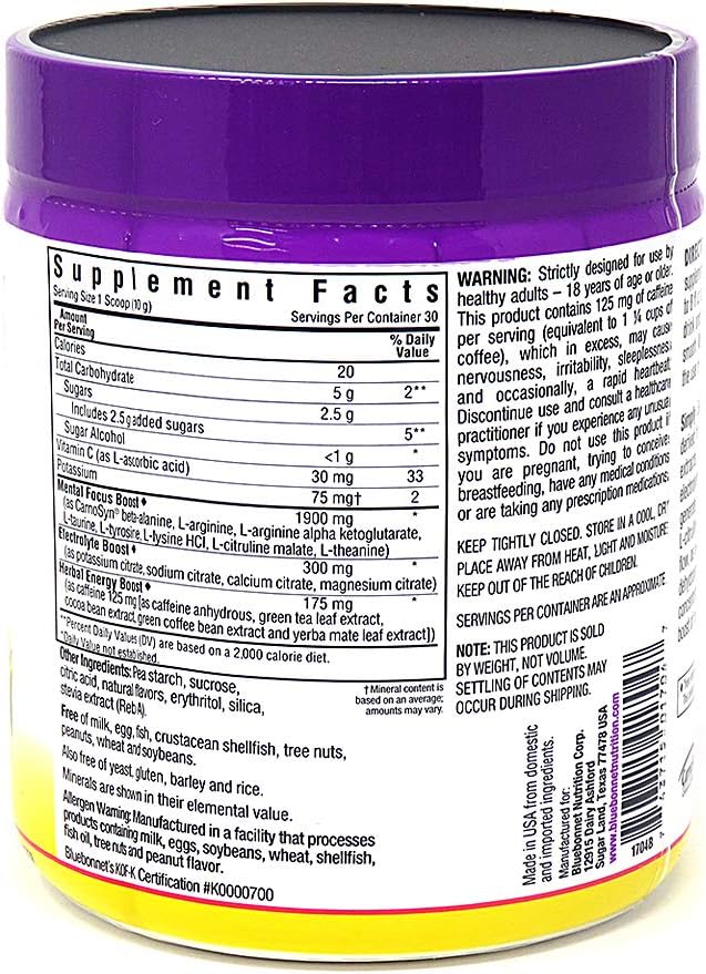 DESCRIPTION : Bluebonnet Nutrition Simply Energy Powder - No Artificial Colors, Flavors or Sweeteners - Soy-Free, Gluten-Free, Non-GMO, Kosher Certified, Dairy-Free, Vegan - 10.58 oz, 30 Servings - Lemon Flavor