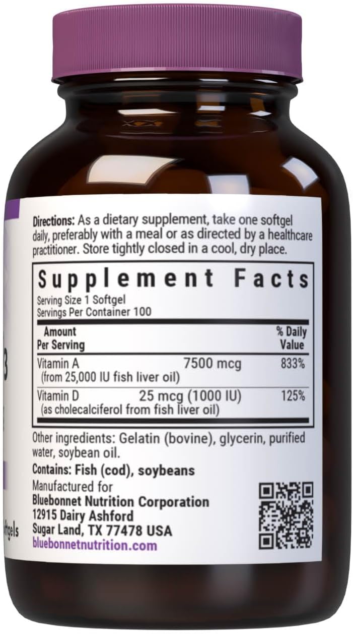 Bluebonnet Nutrition Vitamin A & D3 25,000 Iu/1,000 Iu From Deep Sea, Cold Water, Fish Oil - For Eye Health & Immune Function* - Gluten Free - Dairy Free - Molecularly Distilled - 100 Softgel/Servings