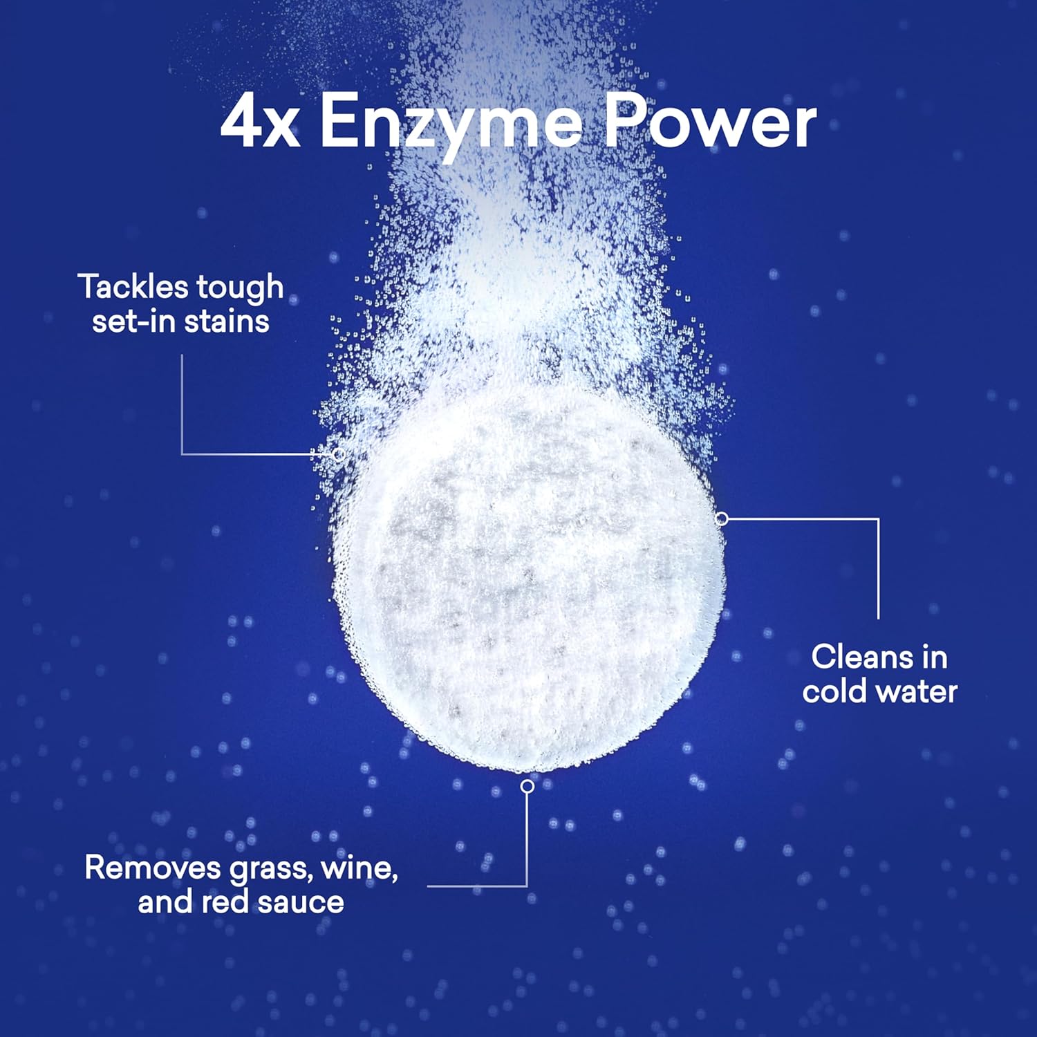 EFFECTIVE. Patented detergent tablet powered by enzymes is proven to lift the toughest stains, from grass and coffee to food and makeup. Keeps whites white and colors bright