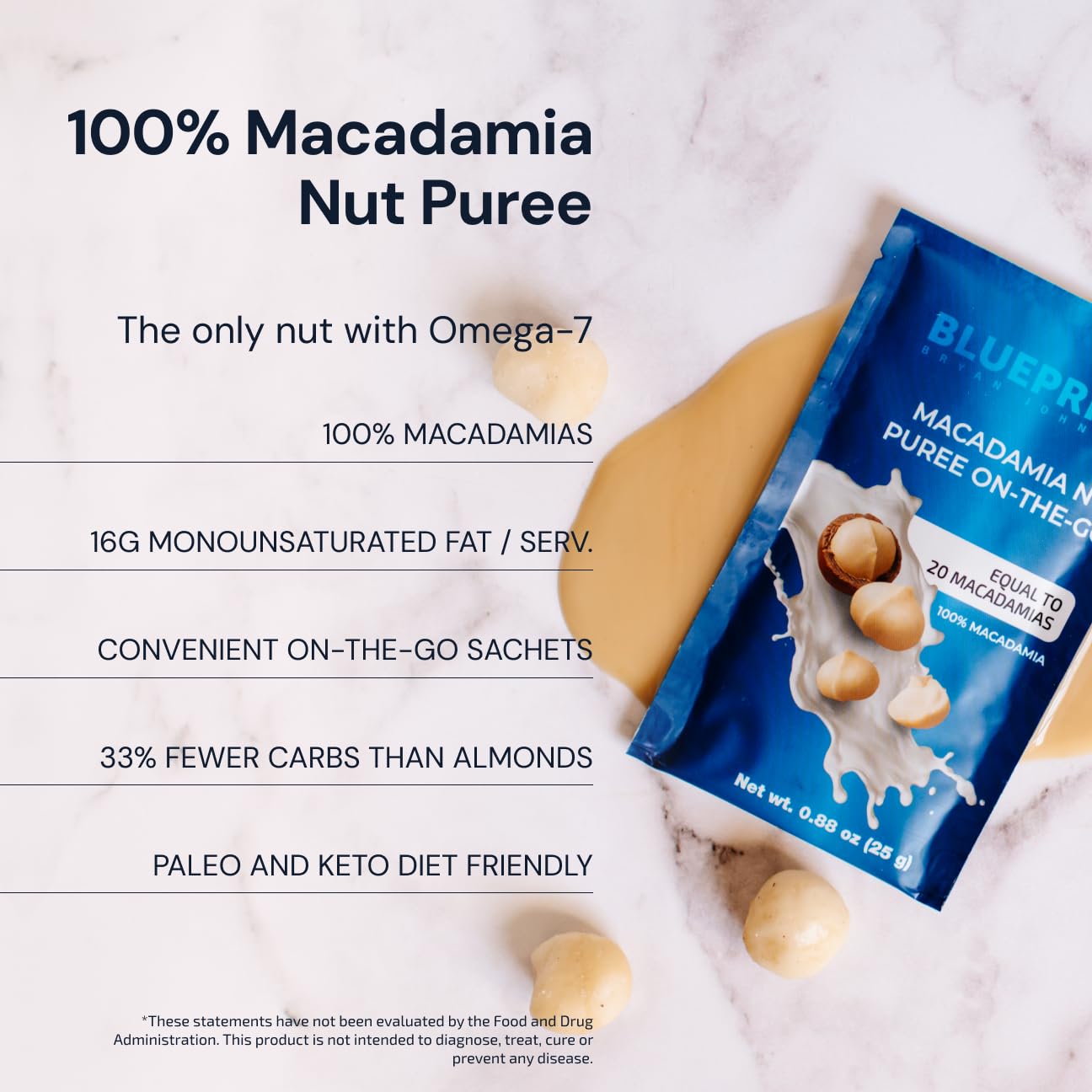 About this item Just Add Water for Macadamia Milk: This single-ingredient puree is designed to mix with water for fresh, smooth macadamia milk, no gums, no oils, no junk, perfect for travel, work, or daily use at home. 100% Macadamia Nut Puree, Nothing Added: Made with only macadamia nuts, no thickeners, sweeteners, or preservatives, ideal for clean-label lifestyles, ingredient-conscious diets, and functional nutrition routines. Gum-Free, Shelf-Stable Milk Alternative: A clean alternative to processed shelf-stable plant milks, this macadamia milk base contains no gums, thickeners, or stabilizers for a better dairy-free milk experience. Keto, Paleo & Plant-Based Compatible: healthy fats and low in carbs, this macadamia milk base fits keto, paleo, and vegan diets, ideal for lattes, smoothies, cereal, and clean eating routines. Travel-Ready Macadamia Milk Solution: Each single-serve pouch is lightweight, portable, and TSA-compliant, designed to make fresh nut milk wherever you are, no refrigeration or bulky cartons required. Blueprint-Backed Precision Nutrition: Part of the Blueprint protocol by Bryan Johnson, this macadamia milk base supports long-term health with clean ingredients and minimalist, science-aligned formulation.* Tested for Purity & Quality: Every batch is tested for quality, offering clean-label nuts made without fillers or additives, just honest ingredients for confident, delicious enjoyment. *These statements have not been evaluated by the Food and Drug Administration. This product is not intended to diagnose, treat, cure or prevent any disease. › See more product details,Just Add Water for Macadamia Milk: This single-ingredient puree is designed to mix with water for fresh, smooth macadamia milk, no gums, no oils, no junk, perfect for travel, work, or daily use at home,100% Macadamia Nut Puree, Nothing Added: Made with only macadamia nuts, no thickeners, sweeteners, or preservatives, ideal for clean-label lifestyles, ingredient-conscious diets, and functional nutrition routines,Gum-Free, Shelf-Stable Milk Alternative: A clean alternative to processed shelf-stable plant milks, this macadamia milk base contains no gums, thickeners, or stabilizers for a better dairy-free milk experience,Keto, Paleo & Plant-Based Compatible: healthy fats and low in carbs, this macadamia milk base fits keto, paleo, and vegan diets, ideal for lattes, smoothies, cereal, and clean eating routines,Travel-Ready Macadamia Milk Solution: Each single-serve pouch is lightweight, portable, and TSA-compliant, designed to make fresh nut milk wherever you are, no refrigeration or bulky cartons required,Blueprint-Backed Precision Nutrition: Part of the Blueprint protocol by Bryan Johnson, this macadamia milk base supports long-term health with clean ingredients and minimalist, science-aligned formulation,Tested for Purity & Quality: Every batch is tested for quality, offering clean-label nuts made without fillers or additives, just honest ingredients for confident, delicious enjoyment,*These statements have not been evaluated by the Food and Drug Administration. This product is not intended to diagnose, treat, cure or prevent any disease