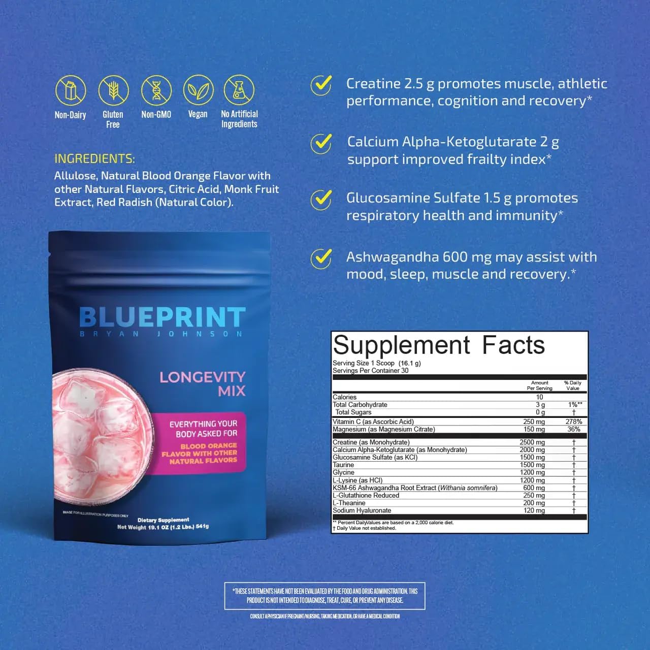High Quality Ingredients: Blueprint Longevity Mix Contains: Caakg, Ashwagandha Ksm66, Creatine Monohydrate, Glycine, L-Theanine, Glutathione Reduced, Sodium Hyaluronate, Vitamin C (Ascorbic Acid), Lysine, Taurine, Calcium, And Magnesium Citrate, Each Sip Of Longevity Mix Delivers A Potent Dose Of Essential Nutrients That Your Body Craves