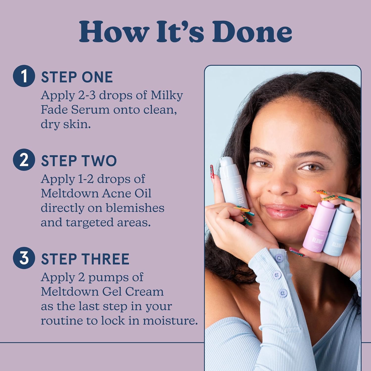 Clearer Skin, Anywhere - The ultimate on-the-go travel skincare kit for acne-prone skin. Featuring three best-selling Blume products, this TSA-approved facial kit helps fight breakouts, fade dark spots, and deeply hydrate in one easy 3-step routine. Meltdown Acne Oil - This skin care kit for women and men contains our fast-acting face serum designed to target breakouts, reduce redness, and act as a pore reducer without stripping moisture. This award-winning, non-comedogenic facial oil balances hydration while clearing blemishes, making it an essential part of any acne skin care routine. Milky Fade Serum - Milky Fade is a gentle yet powerful vitamin C and niacinamide serum designed to fade the look of dark spots, blemish scars, and redness while enhancing overall radiance. This skin care mini brightening face serum strengthens the moisture barrier and leaves your complexion visibly smooth, plump, and hydrated. Available in both regular and travel size skincare bottles. Meltdown Gel Cream - A skincare travel kit essential, Meltdown facial moisturizer is a weightless, fast-absorbing gel moisturizer for face concerns like blemishes, and sensitive and combination skin. Clinically proven to deliver 72-hour hydration, it soothes, plumps, and protects skin and pairs perfectly with the other products in our travel set. Setting a New Standard - Many brands, especially in period care, make facial, body, and skin care sets & kits that take centuries to biodegrade with ingredients we canāt pronounce. At Blume, weāre different. We believe in products that are good for your body and the environment. This skincare gift set is vegan, cruelty-free, paraben-free, and sulfate-free. āŗ See more product details,Clearer Skin, Anywhere - The ultimate on-the-go travel skincare kit for acne-prone skin. Featuring three best-selling Blume products, this TSA-approved facial kit helps fight breakouts, fade dark spots, and deeply hydrate in one easy 3-step routine,Meltdown Acne Oil - This skin care kit for women and men contains our fast-acting face serum designed to target breakouts, reduce redness, and act as a pore reducer without stripping moisture. This award-winning, non-comedogenic facial oil balances hydration while clearing blemishes, making it an essential part of any acne skin care routine,Milky Fade Serum - Milky Fade is a gentle yet powerful vitamin C and niacinamide serum designed to fade the look of dark spots, blemish scars, and redness while enhancing overall radiance. This skin care mini brightening face serum strengthens the moisture barrier and leaves your complexion visibly smooth, plump, and hydrated. Available in both regular and travel size skincare bottles,Meltdown Gel Cream - A skincare travel kit essential, Meltdown facial moisturizer is a weightless, fast-absorbing gel moisturizer for face concerns like blemishes, and sensitive and combination skin. Clinically proven to deliver 72-hour hydration, it soothes, plumps, and protects skin and pairs perfectly with the other products in our travel set,Setting a New Standard - Many brands, especially in period care, make facial, body, and skin care sets & kits that take centuries to biodegrade with ingredients we canāt pronounce. At Blume, weāre different. We believe in products that are good for your body and the environment. This skincare gift set is vegan, cruelty-free, paraben-free, and sulfate-free