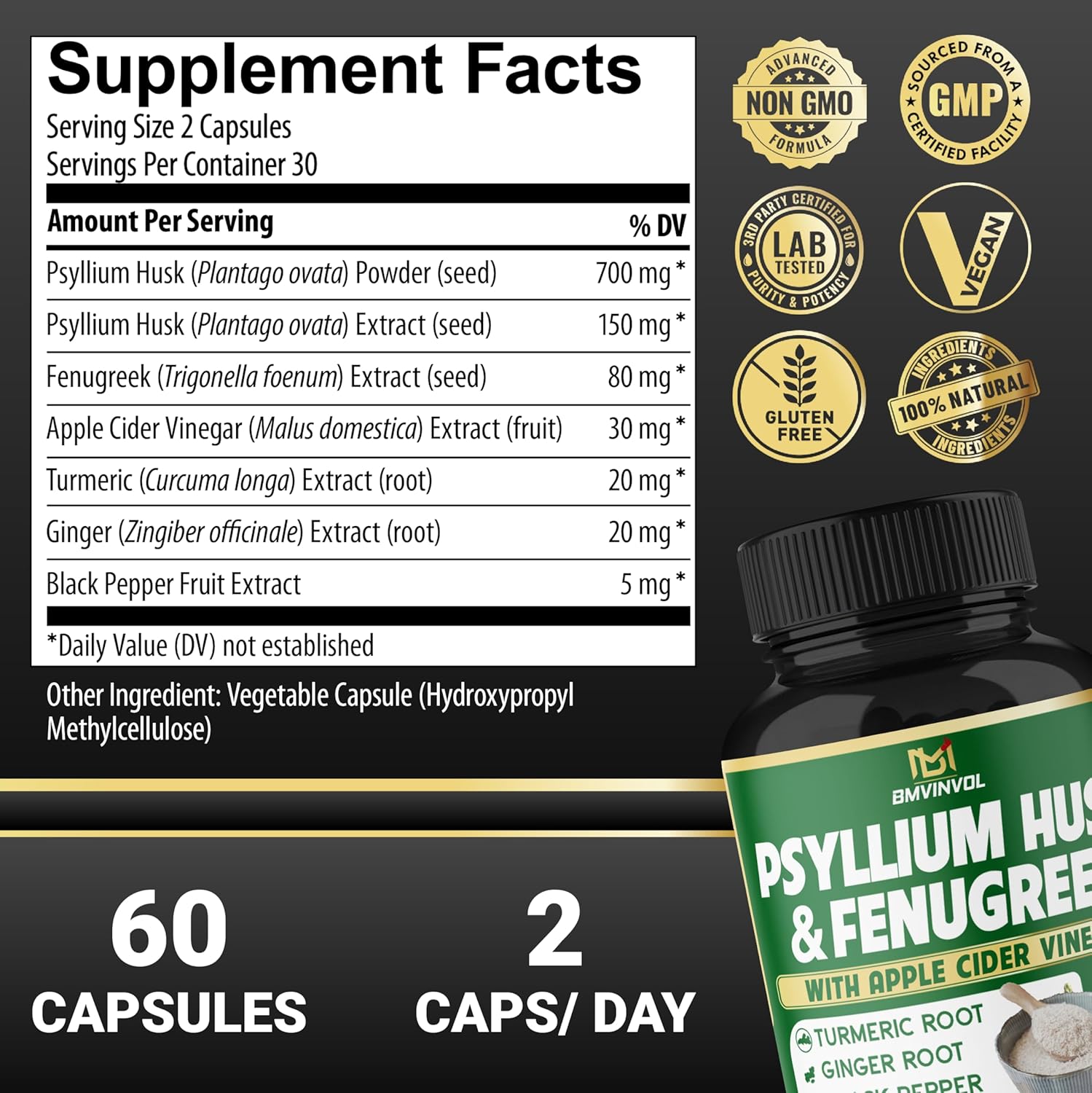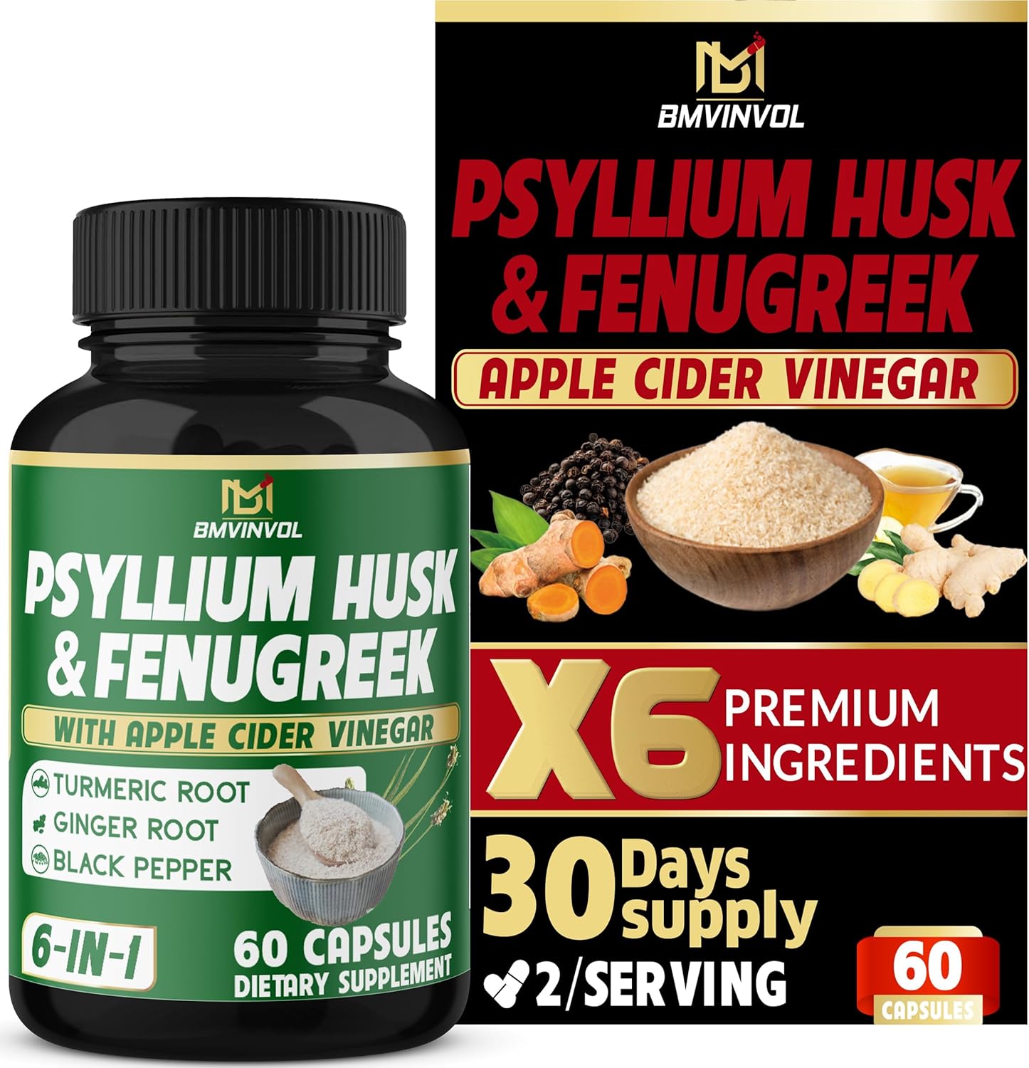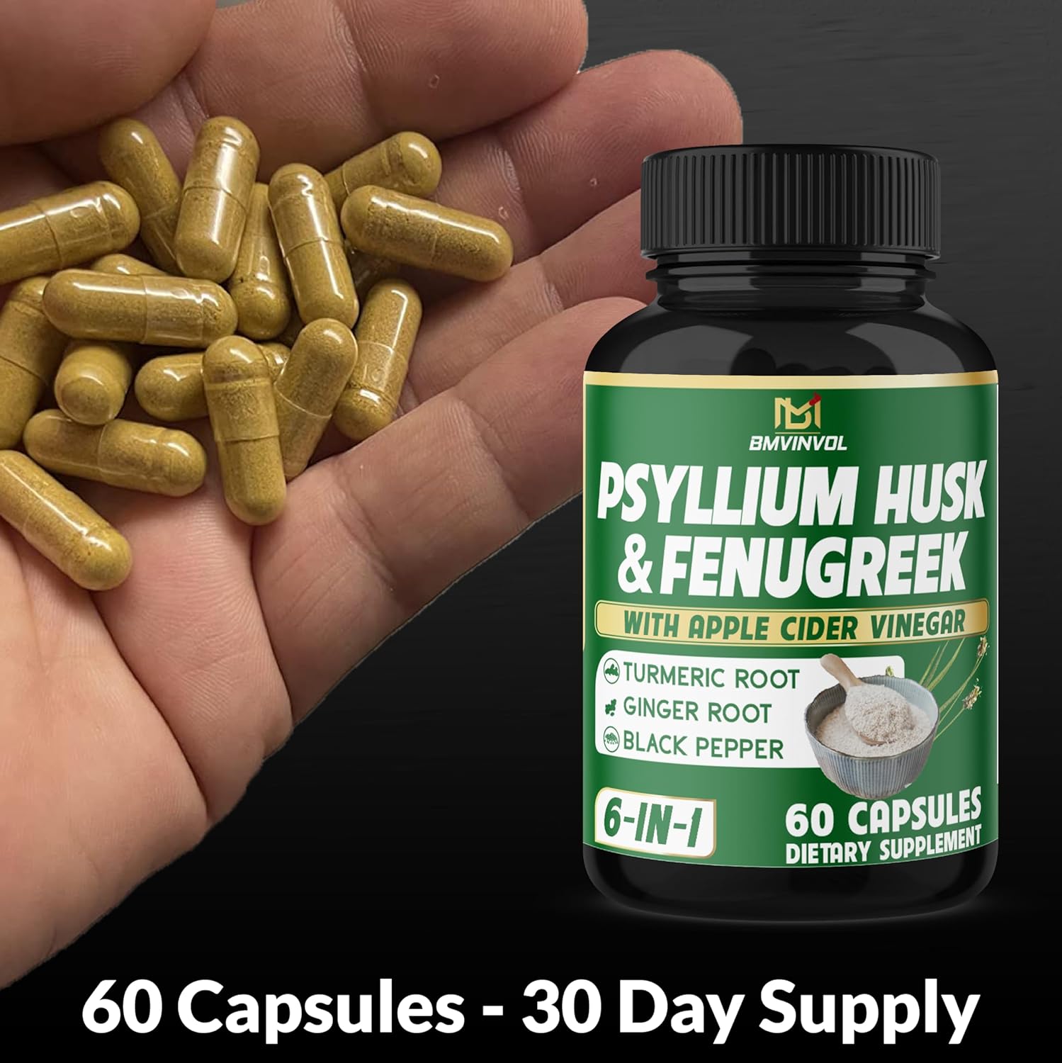 Bmvinvol 6In1 Psyllium Husk, Fenugreek, Apple Cider Vinegar, Turmeric, Ginger, Black Pepper - Soluble Fiber For Supports Digestive Health & Regularity (60 Capsules)