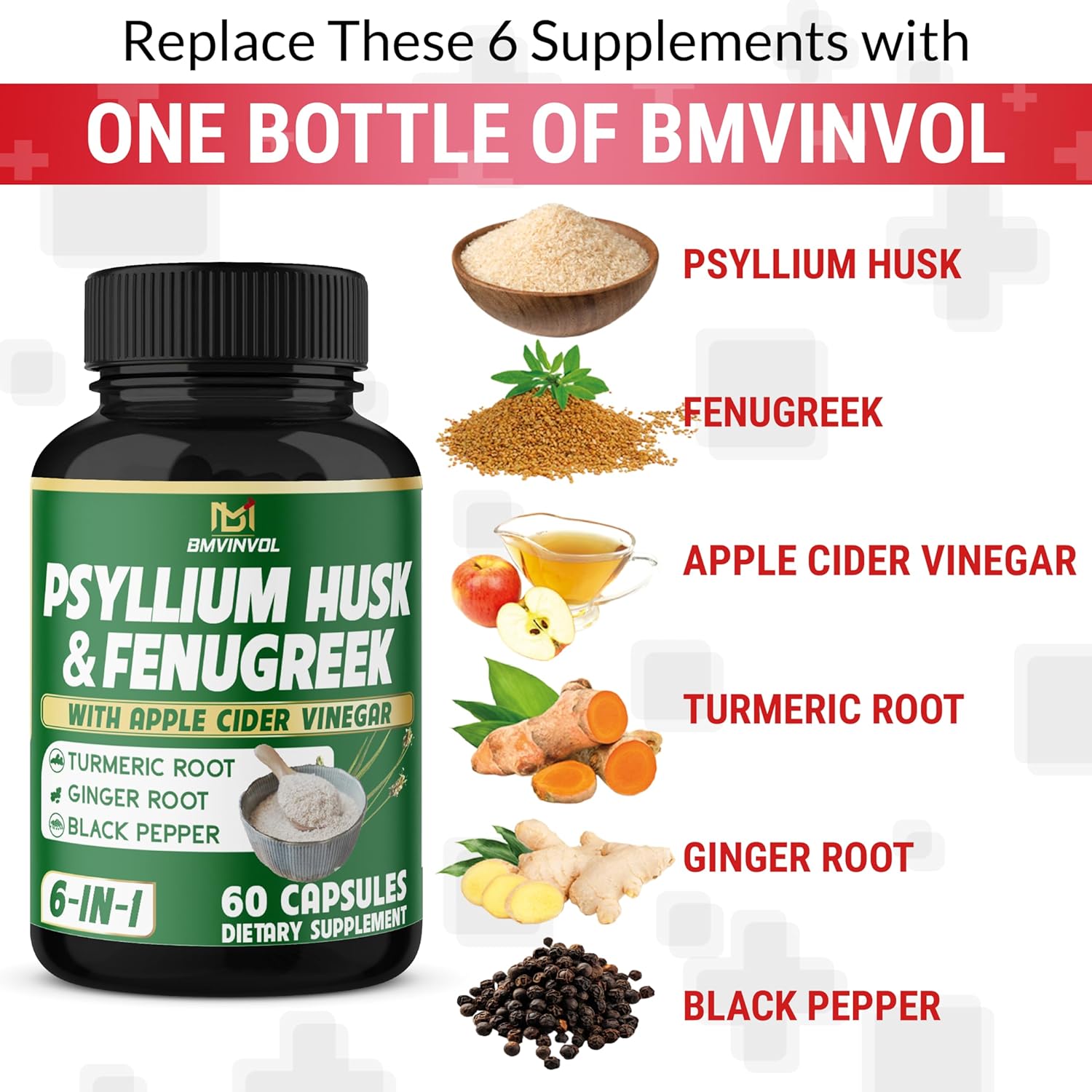 About this item All-in-One Supplement: Our product contains the most important ingredients and cuts out the fluff! Rather than taking 5 or 6 different products that only include one essential ingredient. Psyllium Husk Blend: Our psyllium husk formula includes 6 powerful ingredients, including: Psyllium Husk, Fenugreek, Apple Cider Vinegar, Turmeric Root, Ginger Root, and Black Pepper. All ingredients are processed in the correct proportions to create a 6-in-1 psyllium husk capsule, providing you with excellent health benefits. With a total of 60 capsules, each packed with powerful herbal ingredients to support your overall well-being. As a dietary supplement, take two (2) capsules 1 time a day. It is highly beneficial for our overall health. At BMVINVOL, we manufacture our products in a cGMP-certified facility, ensuring the highest standards of quality. › See more product details,All-in-One Supplement: Our product contains the most important ingredients and cuts out the fluff! Rather than taking 5 or 6 different products that only include one essential ingredient,Psyllium Husk Blend: Our psyllium husk formula includes 6 powerful ingredients, including: Psyllium Husk, Fenugreek, Apple Cider Vinegar, Turmeric Root, Ginger Root, and Black Pepper,All ingredients are processed in the correct proportions to create a 6-in-1 psyllium husk capsule, providing you with excellent health benefits,With a total of 60 capsules, each packed with powerful herbal ingredients to support your overall well-being. As a dietary supplement, take two (2) capsules 1 time a day. It is highly beneficial for our overall health,At BMVINVOL, we manufacture our products in a cGMP-certified facility, ensuring the highest standards of quality