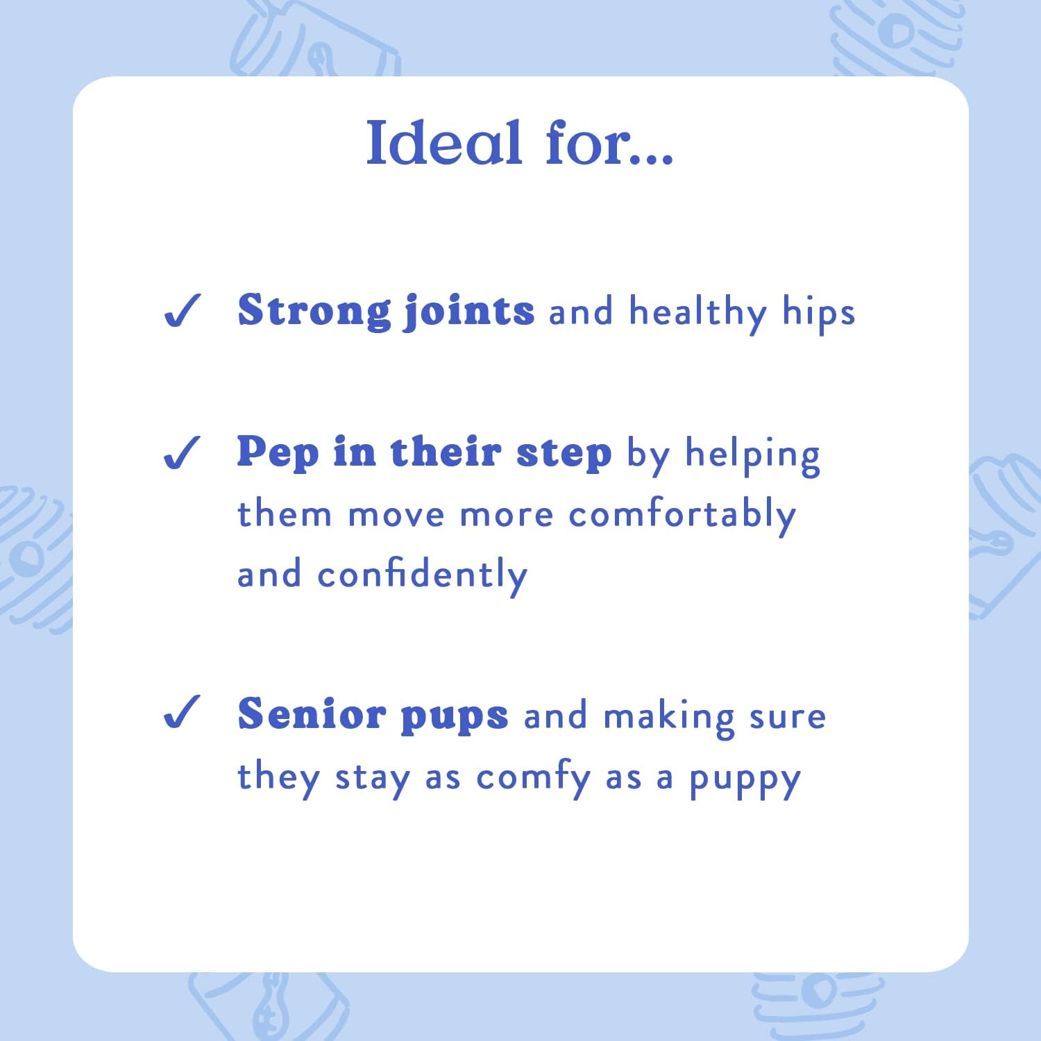 Letās keep the pep in your pupās step! An advanced (... and extra tasty!) formula to help your dog move more comfortably and confidently ā without the artificial flavors