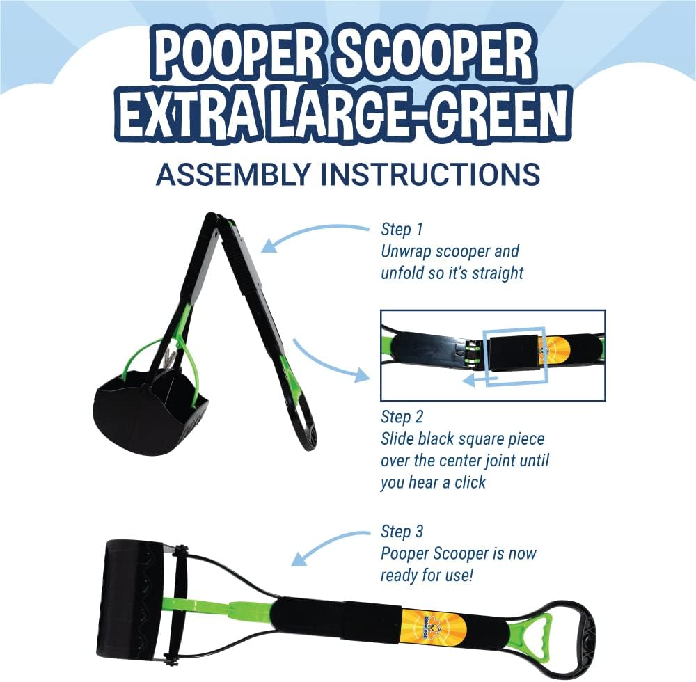 Quick & Easy Assembly: We Make Transporting And Assembling Your Pooper Scooper Quick And Easy. Simply Unfold Your Pooper Scooper When You Receive It And Put It In A Straight Position. Slide The Black Square Piece Over The Center Joint Until You Hear A Click. Now Your Pooper Scooper Is Ready For Action! If Needed The Pooper Scooper Can Be Disassembled Quickly Back To Its Folded Position To Save Space. Picking Up After Your Small Or Large Pet Has Never Been So Easy