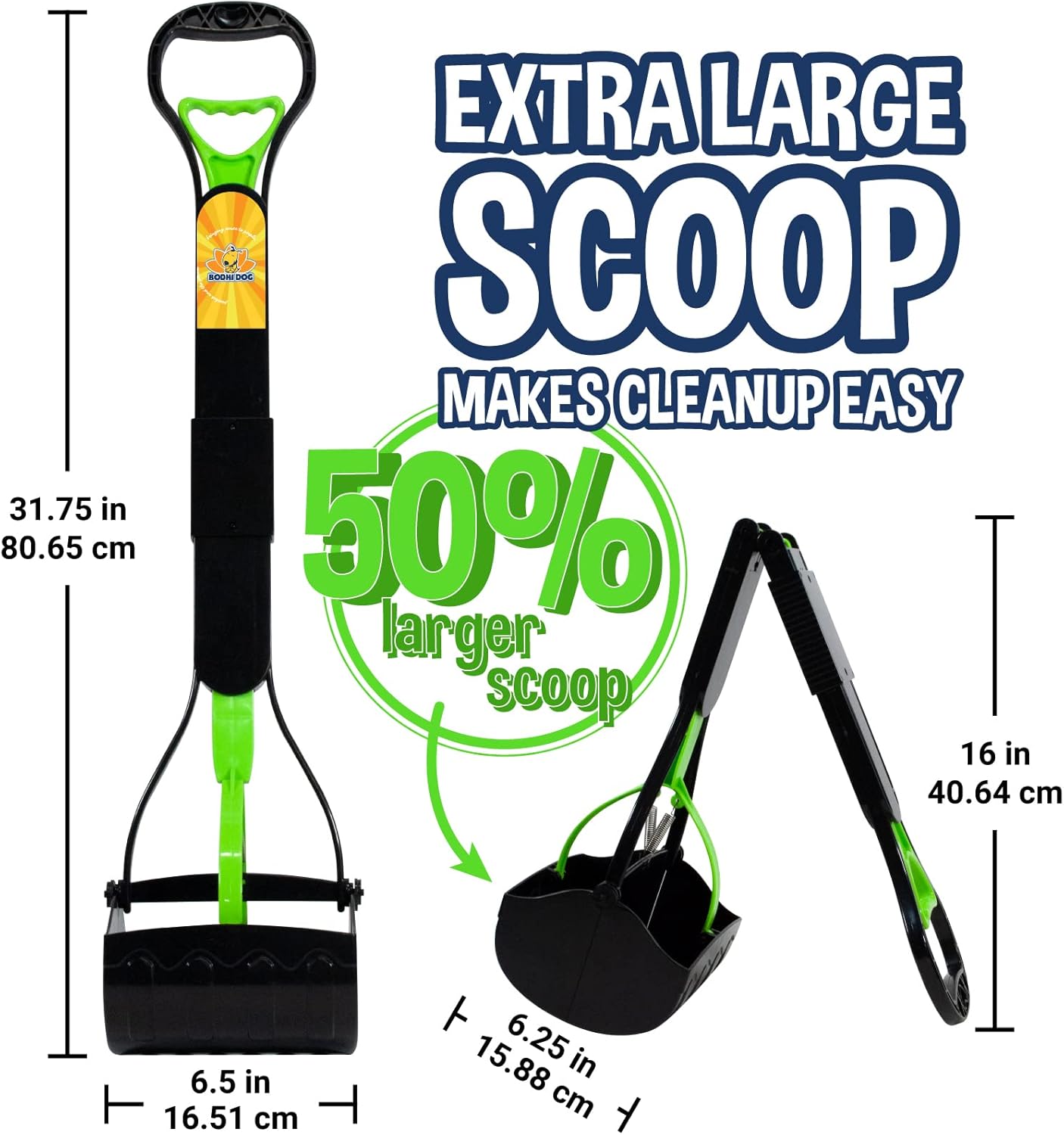 New & Improved Design: Our New And Improved Bodhi Dog Foldable Pooper Scooper Makes Picking Up Messes A Breeze And Your Back Will Thank You! We Designed Our New Pooper Scooper To Make Cleaning After Your Small Or Large Pet Easy And No Need To Bend Down Thanks To The 32β Length. The Pooper Scooper Is Easy To Transport Thanks To The Folding Design And Now Has A 50% Larger Scoop Than The Original Pooper Scooper. It Is Perfect To Pick Up All Types Of Messes Whether Big Or Small