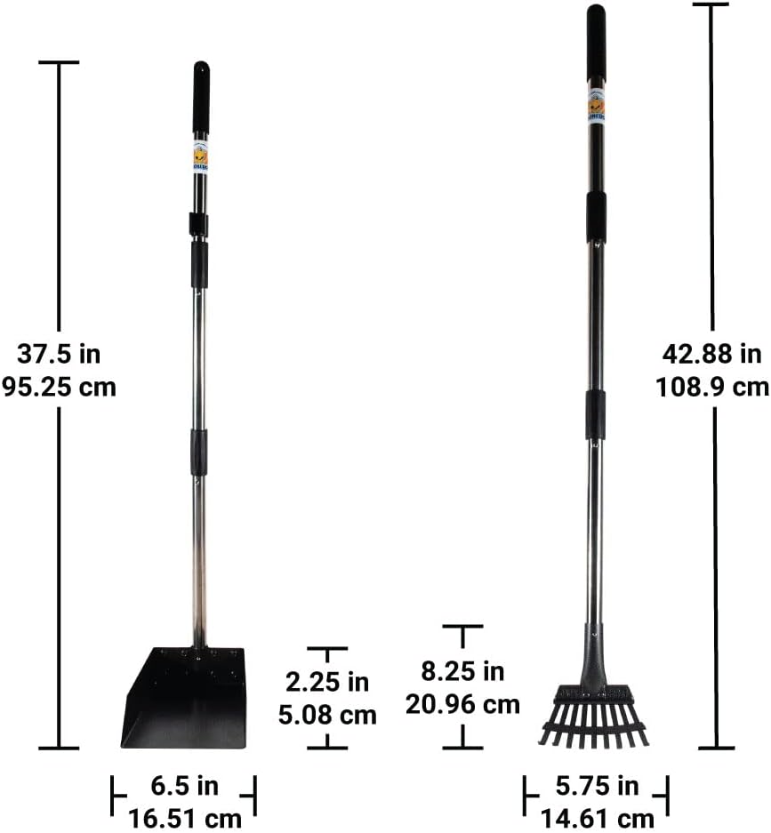 Adjustable Design: No Need To Bend Down With Our Easy To Adjust Pooper Scooper With Rake And Bin. Picking Up After Your Dog Is Easy For Everyone! Our Bin Measures At 37.4” Tall And Our Rake Measures At 36.2” Tall. If Needed The Height Of The Bin And Rake Can Be Adjusted Simply By Removing The Middle Tube Section Of The Pole