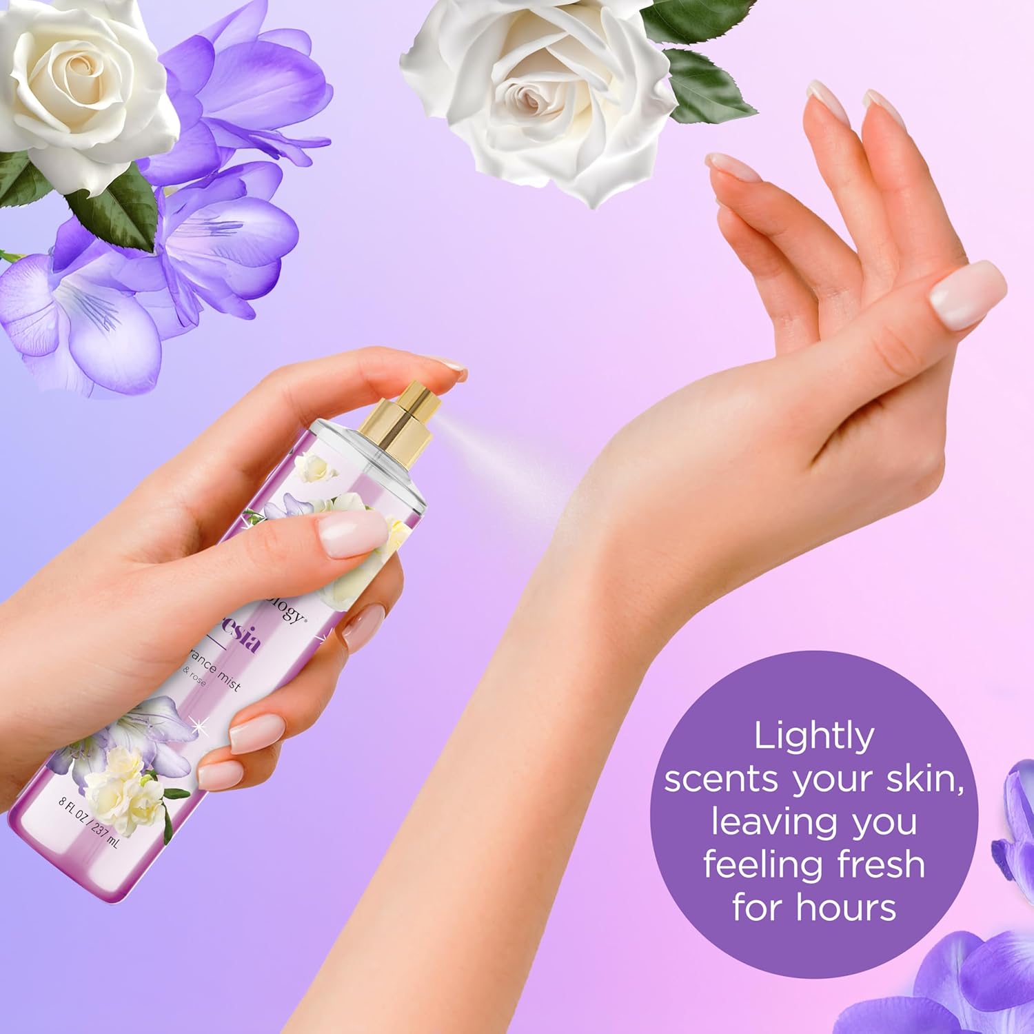 About this item FLORAL ESCAPE: The Bodycology Freesia Fragrance Body Mist will wrap you in the delicate scent of florals & musk FLORAL & WOODY SCENT: Enjoy the fragrance notes of freesia, soft rose and warm sandalwood THE PERFECT AMOUNT OF PERFUME: Delicately scents your skin without being too overpowering MIX IT UP: Spritz on your wrists, neck, and shoulders or spray in the air and let the fine mist surround you NO HARSH INGREDIENTS: No sulfates, no aluminum, and paraben & phthalate free › See more product details,FLORAL ESCAPE: The Bodycology Freesia Fragrance Body Mist will wrap you in the delicate scent of florals & musk,FLORAL & WOODY SCENT: Enjoy the fragrance notes of freesia, soft rose and warm sandalwood,THE PERFECT AMOUNT OF PERFUME: Delicately scents your skin without being too overpowering,MIX IT UP: Spritz on your wrists, neck, and shoulders or spray in the air and let the fine mist surround you,NO HARSH INGREDIENTS: No sulfates, no aluminum, and paraben & phthalate free