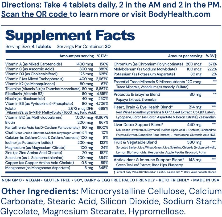 DESCRIPTION : BodyHealth Multi Complete (120 Ct) Daily Multivitamin for Men and Women with Whole Foods, Minerals, Antioxidants, Organic Green Food Concentrates, and Liver Detox Extracts, Vegan and Non GMO