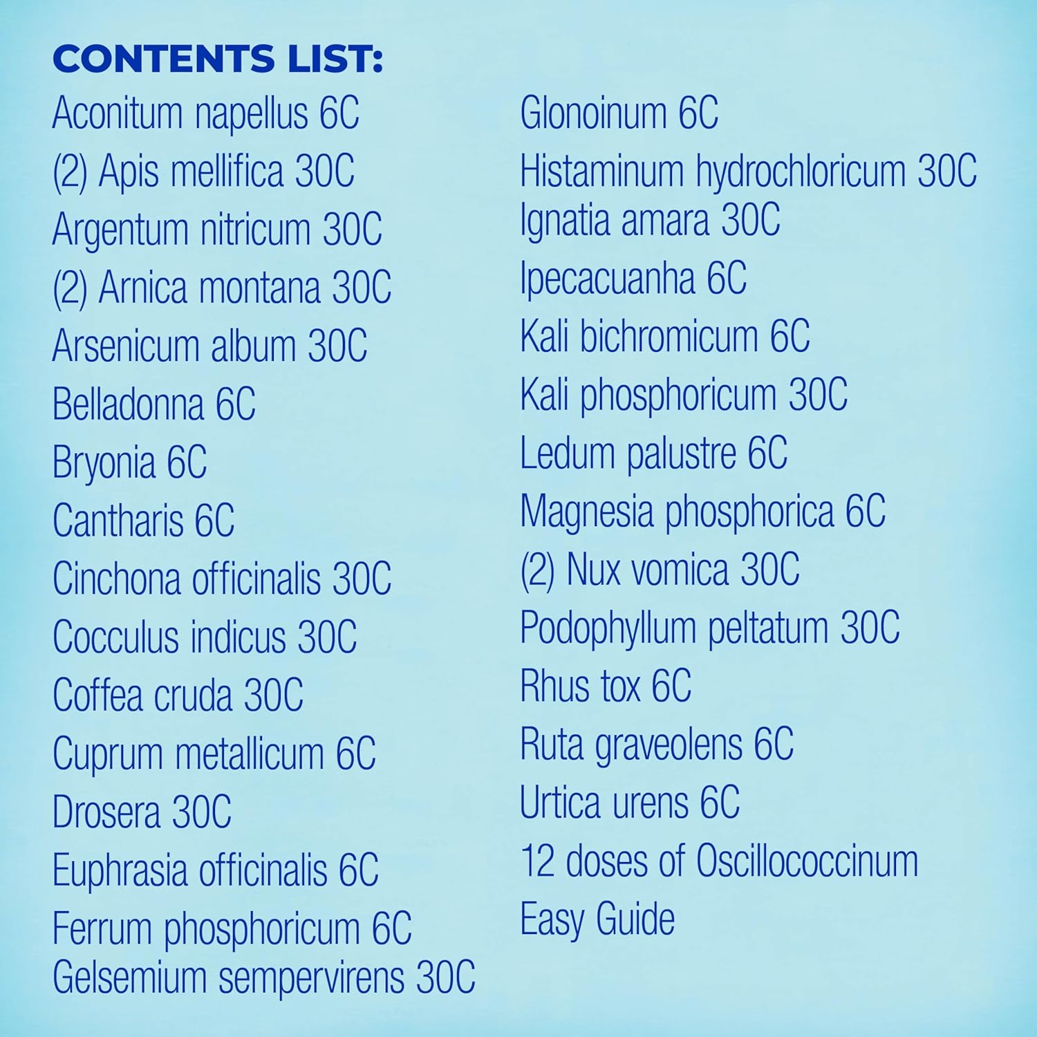 Includes aconitum napellus 30C; apis mellifica 30C; Arnica Montana 30C; arsenicum album 30C; Belladonna 6C; cinchona officinalis 30C; cocculus indicus 6C; coffee cruda 30C; colocynthis 6C