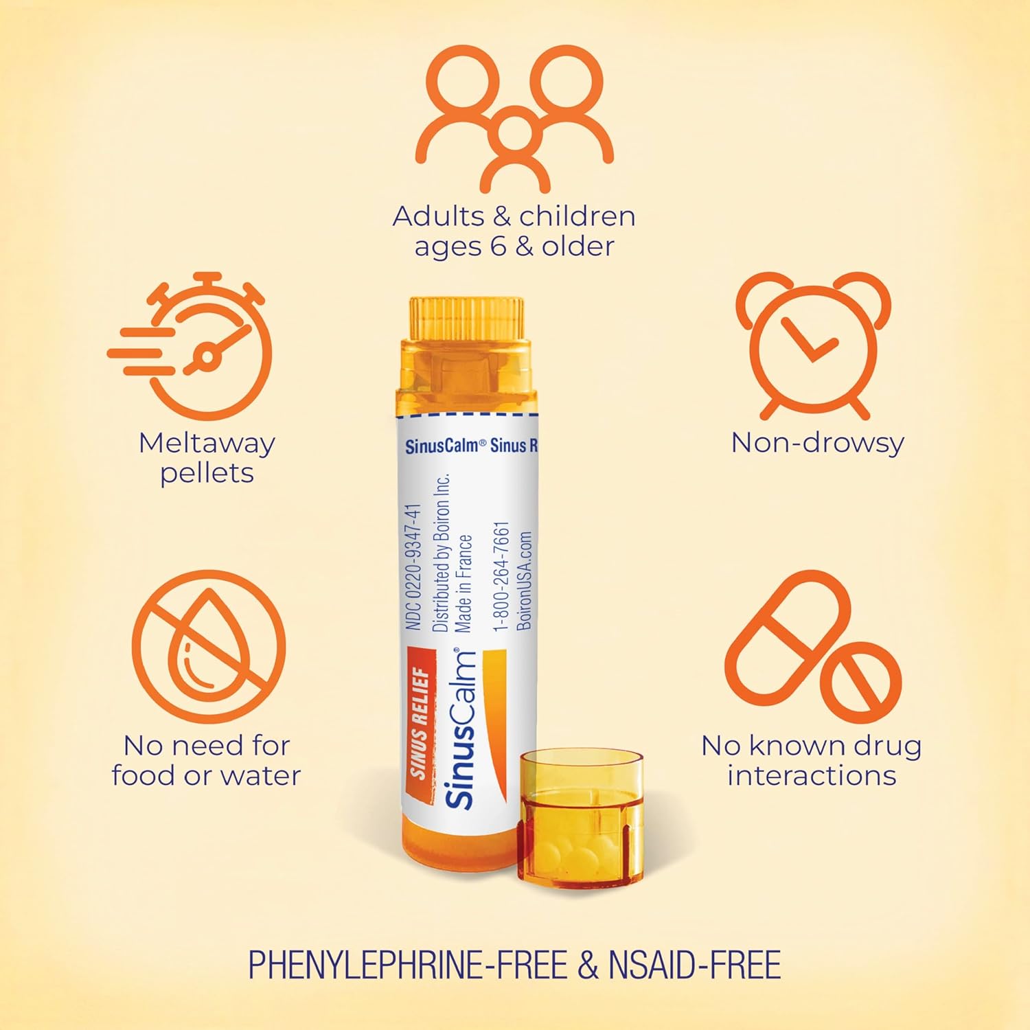 Unlike conventional medications that mask full-blown symptoms, Boiron SinusCalm pellets are specifically designed to relieve nasal congestion, sinus pain and pressure, and headache due to the common cold or allergies. This homeopathic sinus relief medicine targets sinus pain with a stuffy or runny nose. *Borion SinusCalm also works as a sinusitis treatment by providing natural sinus relief and runny nose relief. The slightly sweet pellets melt under the tongue without water, chewing, or swallowing pills, or can be dissolved in water for easier intake. SinusCalm is non-drowsy and phenylephrine-free, and wonât interact with other medications or supplements, including those for colds and allergies â two of the main causes of sinus congestion. It is not habit-forming and thereâs no risk of a rebound. It wonât mask symptoms of a more serious condition. Recommended for everyone ages 6 and up, SinusCalm is available over the counter in two multidose tubes that are easy to use at home or on the go (approximately 80 oral pellets per tube). It also comes in a box of 60 quick-dissolving tablets. Additionally Boiron offers RhinAllergyÂź, ColdCalmÂź, and ThroatCalmÂź,SinusCalm pellets relieves nasal congestion, sinus pain and pressure, and headache due to the common cold or allergies,The non-drowsy, melt-away pellets are phenylephrine-free and wonât interact with other medications. Free from preservatives and artificial colors & flavors,Portable tubes are great for on the go relief!,Slightly sweet pellets melt under the tongue without water, chewing, or swallowing pills. Recommended for everyone ages 6 and up,Two multidose tubes for home or on the go (approximately 80 oral pellets per tube)