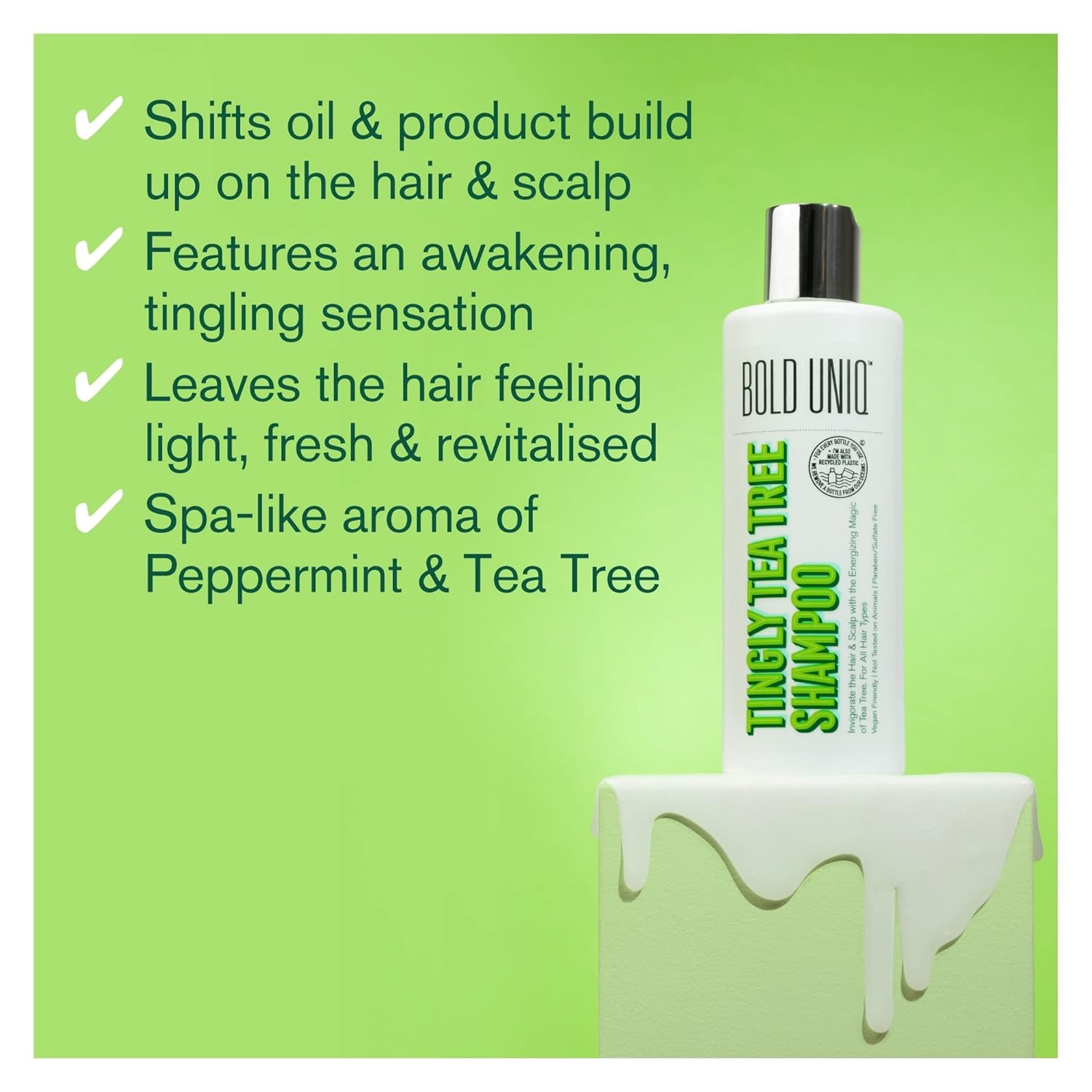How does it work: Life really can weigh down our mood and our hair, this product has been created to lift both your mood and improves the condition of your hair and scalp. The ultra-invigorating formula combines the wonders of Peppermint, Tea Tree and Menthol to create a sensory explosion for your hair and scalpFor all hair types: The tingly wonders of this shampoo can be used on all hair types but it works wonders on those with particularly oily or congested hairDaily purification: The Bold Uniq scientists created this shampoo with daily use in mind, the purifying actives in this formula are paired with Ginger and Caffeine to clarify congested hair types. The energizing formula will leave the hair feeling squeaky clean, and the scalp and senses will be awakened with a cool, tingling sensationSpa-like sensations: This shampoo makes your hair feel great, but we went a step further with a heightened sensory experience! Take a moment to enjoy the tingling sensation and let your senses absorb the spa-like scents of fresh mint, with notes of ice-cool peppermint and soft hints of sweet spearmintResponsible Beauty: Bold Uniq’s mood-boosting clarifying shampoo is cruelty-free and 100% vegan. Our products are never tested on animals, and our packaging is made with recycled plastic in an effort to reduce wasteBOLD UNIQ Tea Tree Shampoo - Energizing Peppermint & Tea Tree Oil Shampoo Formula for Men & Woman. Soothe Itchy & Dry Scalps. Vegan & Cruelty-Free. Sulfate & Paraben Free - 8 Fl.Oz