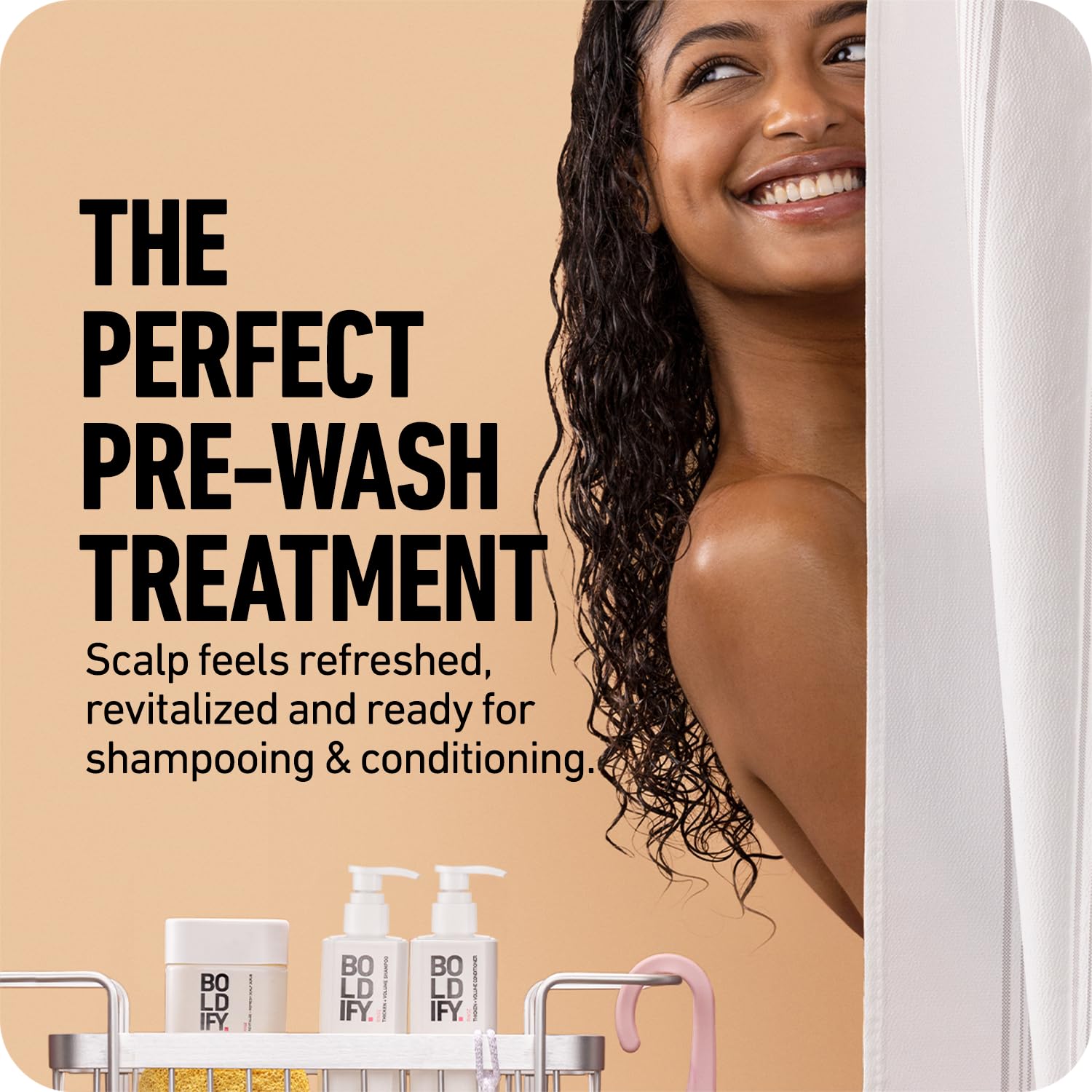PERFECT PRE-WASH TO REMOVE DANDRUFF AND DEBRIS - BOLDIFY Revitalize + Refresh Scalp Scrub's rich texture makes it the ideal pre-wash treatment to help clarify, exfoliate, and prepare the scalp for the nourishment and moisturization to follow with Shampoo and Conditioner use. This sulfate-free micro-foam exfoliant is easy to work into hair, rinsing cleanly without leaving residue or causing dryness