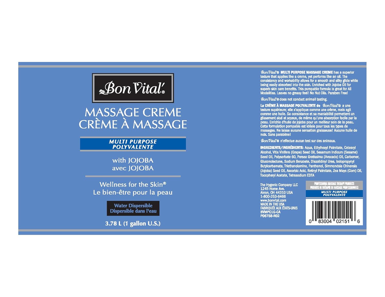 Bon Vital, the #1 preferred brand of massage therapists focusing on professional quality products, provides you with the perfect cremes to give a soothing massage of all modalities and techniques. These cremes give the perfect foundation to heal tired, sore heal muscles while leaving skin soft and conditioned and can be combined with any Bon Vital essential oils to create the ultimate aromatherapy massage experience,Bon Vital's best selling creme with a rich, luxuriously thick consistency and subtle lemon and sage fragrance for an exquisit massage that soothes sore muscles, reduces swelling, and increases circulation throughout the body,Light whipped texture and lower viscosity applies like a creme yet performs like a lightweight oil, allowing for a smooth and silky glide and increased workability,Enriched with Vitamins A, B5, C, and E, a blend of Jojoba and Olive Oil, Shea Butter, Aloe Vera, and more that restore, protect, and thoroughly hydrate dry skin and lock in moisture,Incredibly smooth and easy glide with the right amount of friction for any Swedish, Deep Tissue, or Sports massage,Water dispersible for quick and easy cleanup, pumpable for your convenience, unscented, paraben free, cruelty free, gluten free, no nut oils