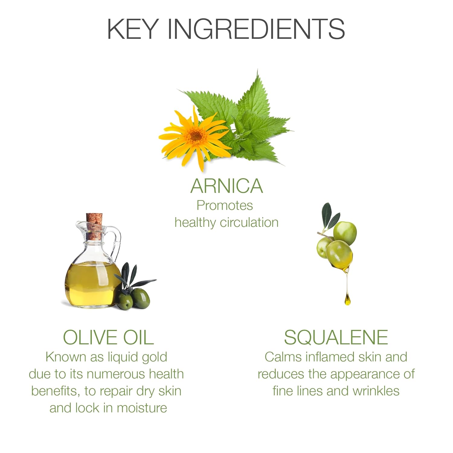 Contains Jojoba, Sesame, and Grapeseed Oils to provide Vitamin E and other antioxidants and Arnica Extract for calming effects to sooth soreness in muscles caused by , fibromyalgia, strains, and general aches