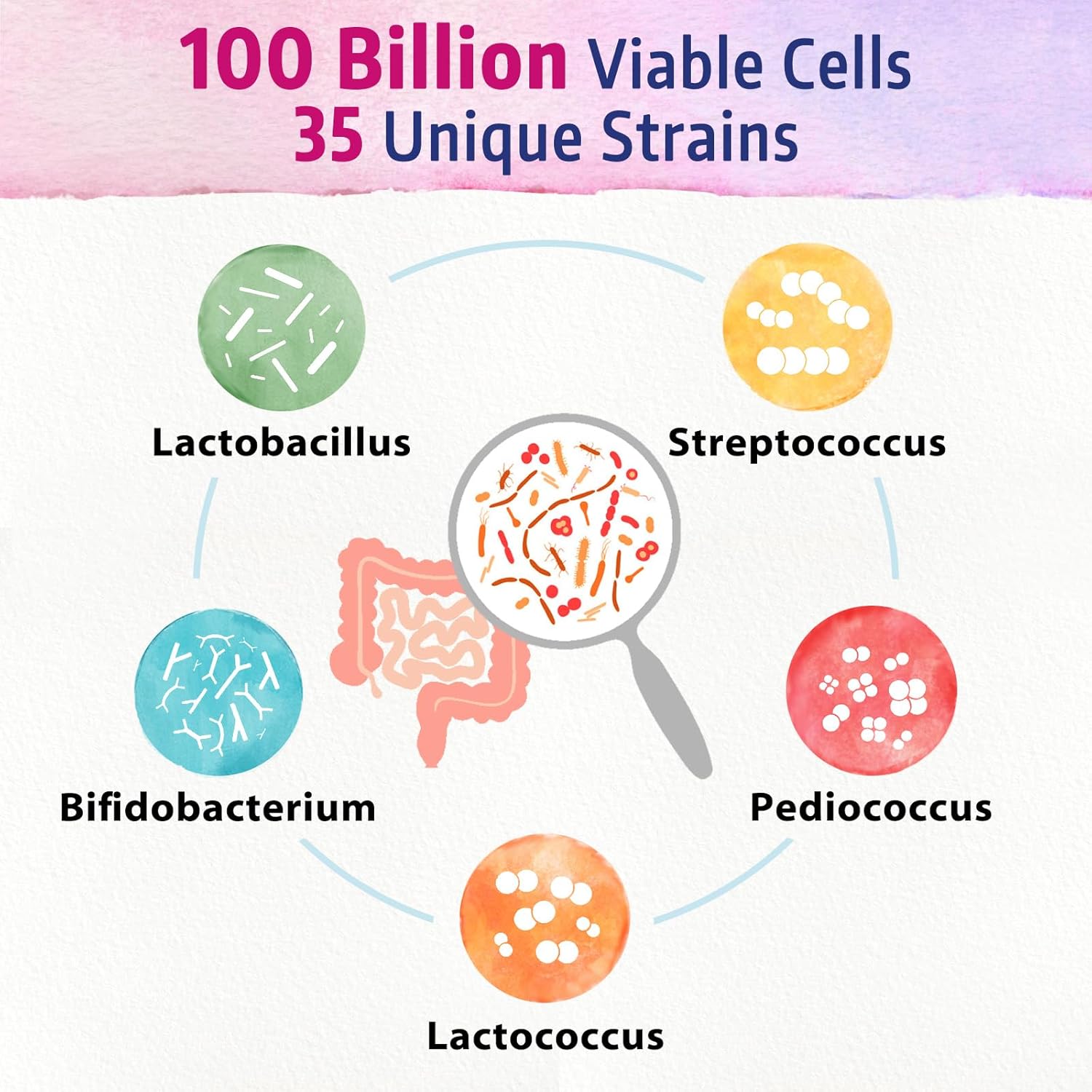 A Large CFU Count and Diverse Strains: Our 4-in-1 Probiotics for Women carries an impressive 100 billion CFU from 35 active strains to increase the microbial richness and diversity in your body.* Each bottle offers a guaranteed shelf life without refrigeration and utilizes delayed-release capsules to ensure these microbesâ survival and delivery to the desired location