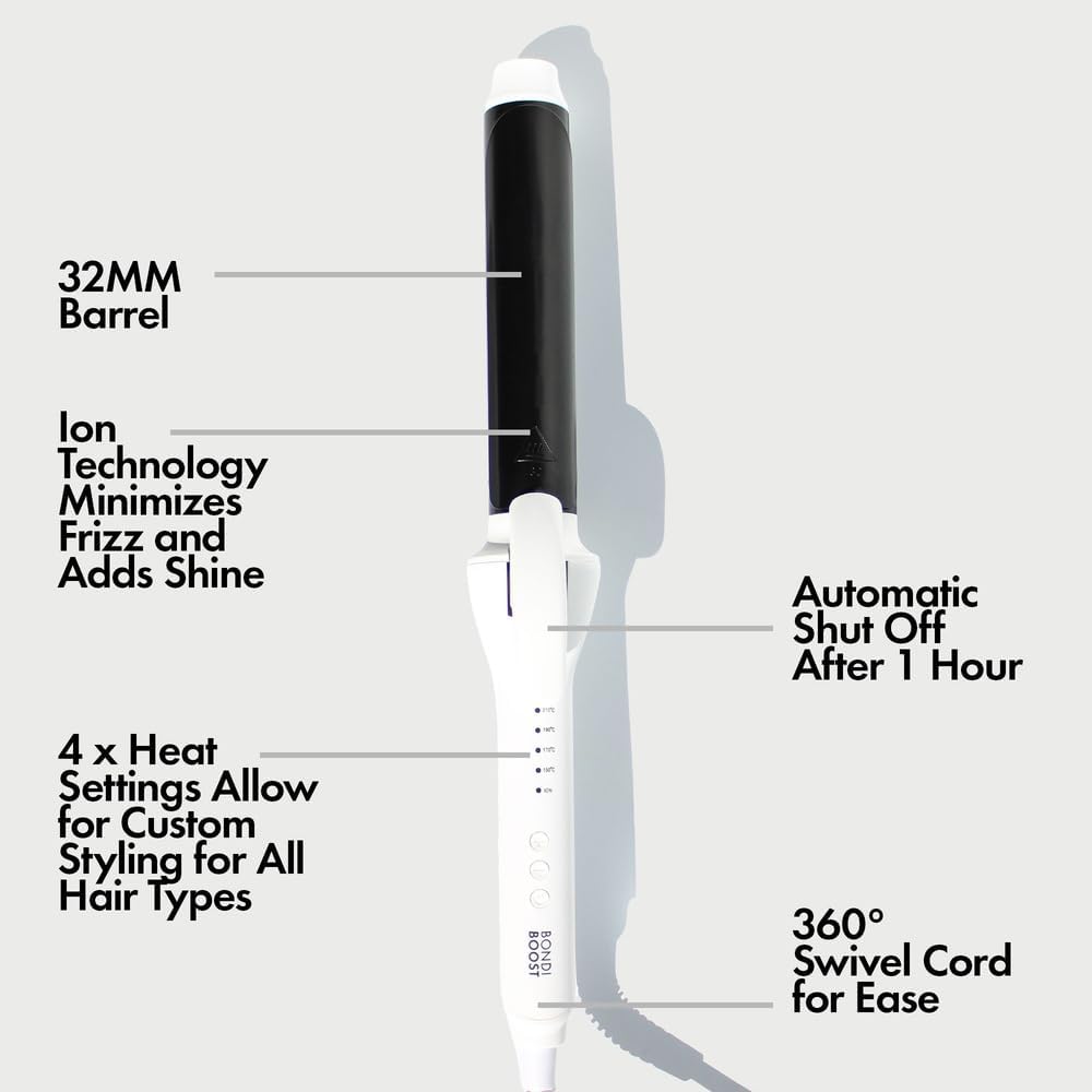 About this item LEVEL UP YOUR HAIR GAME - Get the curls of your dreams with the BondiBoost Clever Curler. BondiBoost's innovative Clever Curler is your go-to curl specialist to create curls effortlessly while helping to protect hair from damage. Includes heat styling glove to help protect hand during styling. ION QUALITY - Our latest styling tool is developed with infrared and ion technologies that help to protect hair, increase shine, tame frizz, and create beautiful lush curls, every single time. Plus, our deluxe barrel and 360° swivel cord allows for styling ease to create effortless beachy waves. (100-240V) PROFESSIONAL QUALITY - Featuring Infrared heating that steams hair from the inside out allowing curls to form at lower temperatures helping to protect hair. Clever Curler quickly heats up for steady performance; automatically shuts down after one hour and contains 4 x heat settings allowing for custom styling for all hair types - from super fine, thin, normal, and coarse textures. HOW TO USE - Use on completely dry hair. Apply a heat protectant before use. Section hair and work with one small section at a time. Clamp hair leaving roots out at the end and wrap around the barrel. Hold and release. Repeat until the whole head is complete. MONEY BACK GUARANTEE - At BondiBoost, we make accessible, results-driven formulations that let your hair do the talking. Our Australian-made formulations are developed by industry experts using high-quality ingredients sourced from local Australian suppliers. If you're not satisfied, that's why we offer a money-back guarantee. Yep, we'll happily refund your cash if you're not completely happy with our products, please reach out DIRECTLY to BondiBoost for a refund." › See more product details,LEVEL UP YOUR HAIR GAME - Get the curls of your dreams with the BondiBoost Clever Curler. BondiBoost's innovative Clever Curler is your go-to curl specialist to create curls effortlessly while helping to protect hair from damage. Includes heat styling glove to help protect hand during styling,ION QUALITY - Our latest styling tool is developed with infrared and ion technologies that help to protect hair, increase shine, tame frizz, and create beautiful lush curls, every single time. Plus, our deluxe barrel and 360° swivel cord allows for styling ease to create effortless beachy waves. (100-240V),PROFESSIONAL QUALITY - Featuring Infrared heating that steams hair from the inside out allowing curls to form at lower temperatures helping to protect hair. Clever Curler quickly heats up for steady performance; automatically shuts down after one hour and contains 4 x heat settings allowing for custom styling for all hair types - from super fine, thin, normal, and coarse textures,HOW TO USE - Use on completely dry hair. Apply a heat protectant before use. Section hair and work with one small section at a time. Clamp hair leaving roots out at the end and wrap around the barrel. Hold and release. Repeat until the whole head is complete,MONEY BACK GUARANTEE - At BondiBoost, we make accessible, results-driven formulations that let your hair do the talking. Our Australian-made formulations are developed by industry experts using high-quality ingredients sourced from local Australian suppliers. If you're not satisfied, that's why we offer a money-back guarantee. Yep, we'll happily refund your cash if you're not completely happy with our products, please reach out DIRECTLY to BondiBoost for a refund