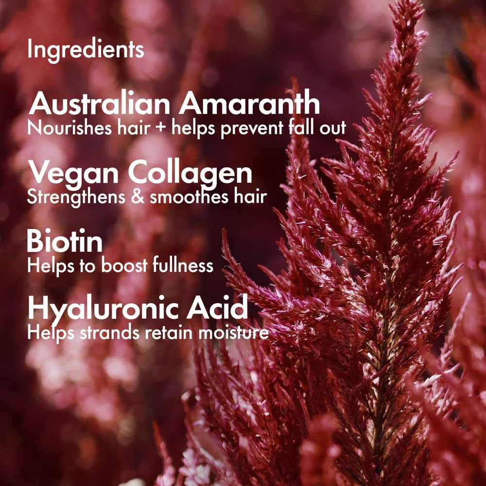 Nourishing Ingredients: Enriched with Hyaluronic Acid for plumping, and Australian Amaranth, Vegan Collagen, and Biotin to strengthen and nourish for visibly fuller hair