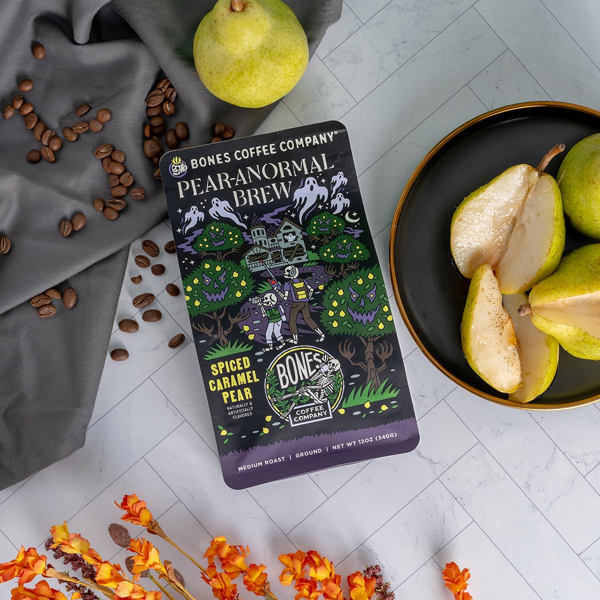 Bones Coffee Company Pear-A-Normal Brew Flavored Coffee Beans, Medium Roast Ground Coffee Low Acid, Caramel & Spiced Pear Flavor (12 Oz)