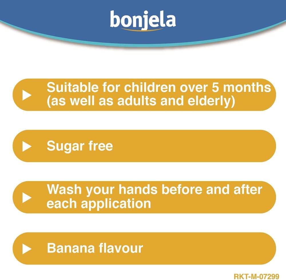 Ingredients Contains 0.5% w/w Lidocaine Hydrochloride and 0.025% w/w Cetylpyridinium Chloride as actives, Aaso contains Ethanol (Alcohol). See leaflet for further information Safety Warning Keep out of the sight and reach of children. Not Suitable For Infants Under 5 Months. WARNING: Do not use more medicine than the label tells you to. Do not use more than every 3 hours. If symptoms persist, consult your doctor or dentist,The information below applies to each unit in the pack,WHY BONJELA Bonjela Junior Gel is a mouth ulcer treatment that helps to reduce discomfort caused by mouth ulcers, including those caused by braces,PAIN RELIEF FROM MOUTH ULCER – Bonjela Junior gel soothes mouth ulcers, including those caused by braces, and fights infection whilst easing pain,AIDS HEALING - As well as reducing pain, Bonjela can help to ease the healing process and protect from infection,BANANA FLAVOUR - The gel is sugar-free and almost colourless with a tasty banana flavour, so is easy and pleasant to administer to children,SUGAR FREE - Its gentle formula is safe for use in children over the age of 5 months and is sugar free