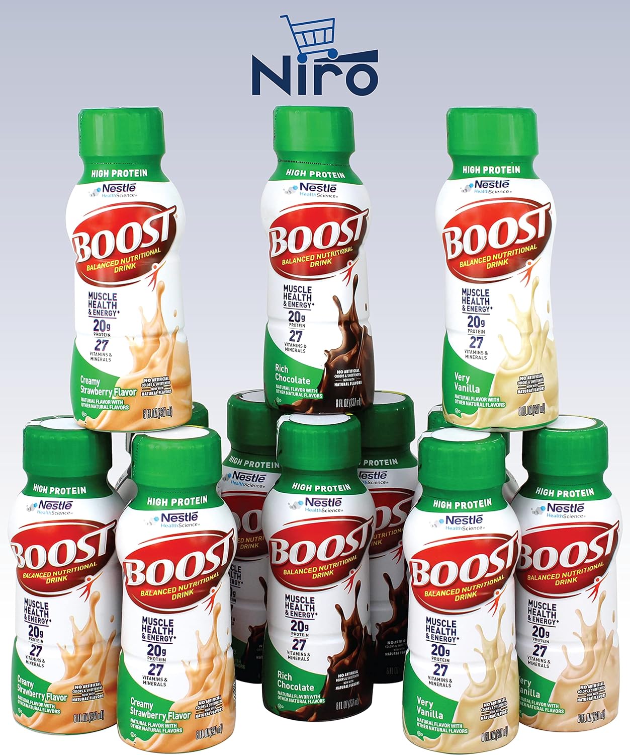 Boost High Protein Shake Variety | High Protein | Boost Rich Chocolate, Boost Creamy Strawberry, And Boost Very Vanilla Flavors | 12 Pack | Niro Assortment | Included One Niro Beverage Sleeve