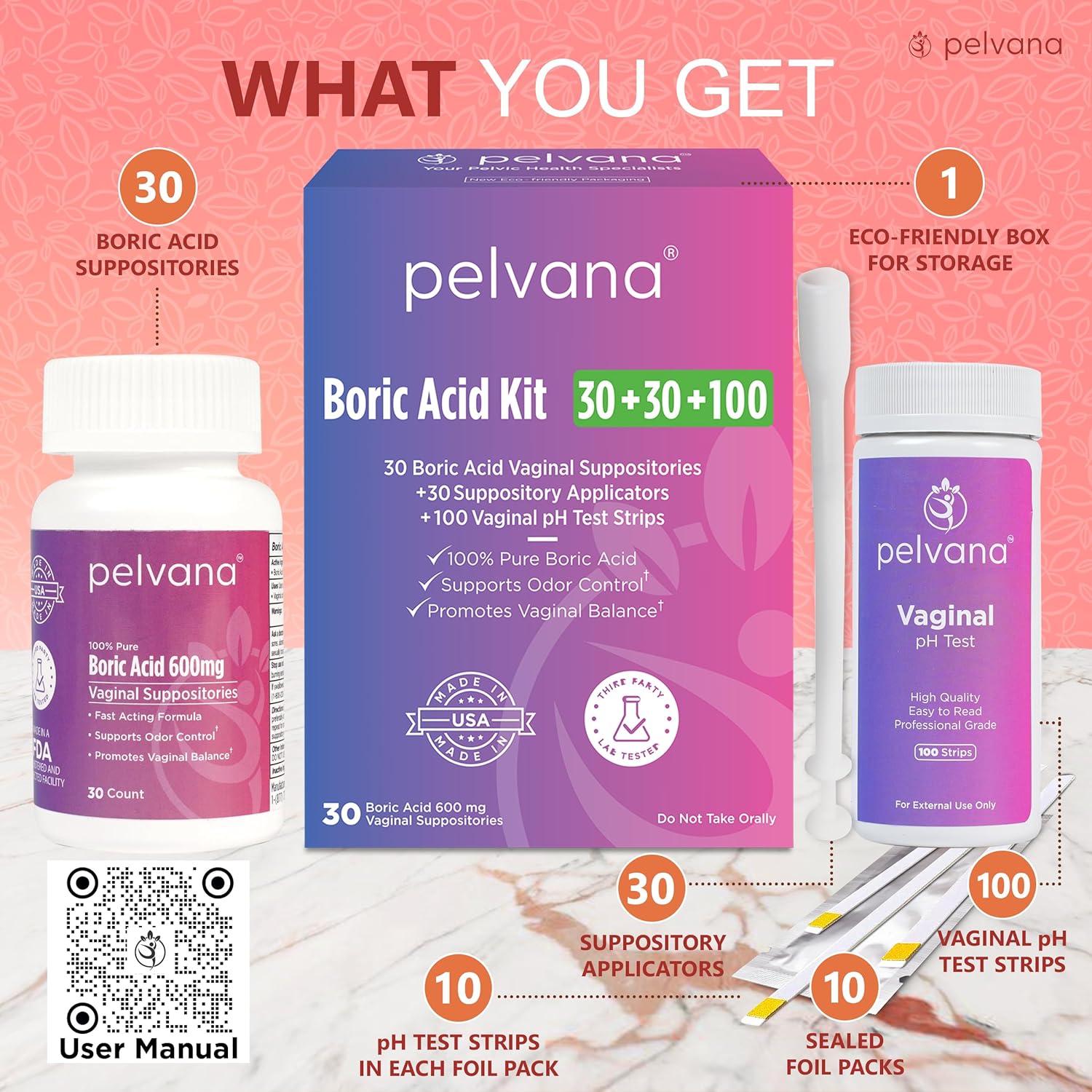 GREAT VALUE - This kit includes 30 boric acid suppositories, 30 applicators, and 100 pH test stripsFAST ACTING - Boric acid helps re-balance your vaginal pH quickly to relieve odor, itching, dryness, and discharge. Many women report feeling fresher in just 12 hoursCAPSULES - Lying on your back with your knees bent and feet flat, use the applicator to insert the capsule as deep as possible into the vaginal canal. Failure to insert the capsule deeply enough into the vaginal canal will prevent the capsule from dissolving properly and may cause it to be expelled when you urinateDURATION - Insert the boric acid capsules before bed for 7 consecutive nights. If unwanted vaginal symptoms persist, repeat boric acid for another 7 nights. You should expect some clear watery discharge, so we recommend sleeping with a panty linerAPPLICATORS - Your body position is critical. Lie on your back with your knees bent and feet flat during insertion to avoid discomfort and jamming the capsule at the tip of the applicator