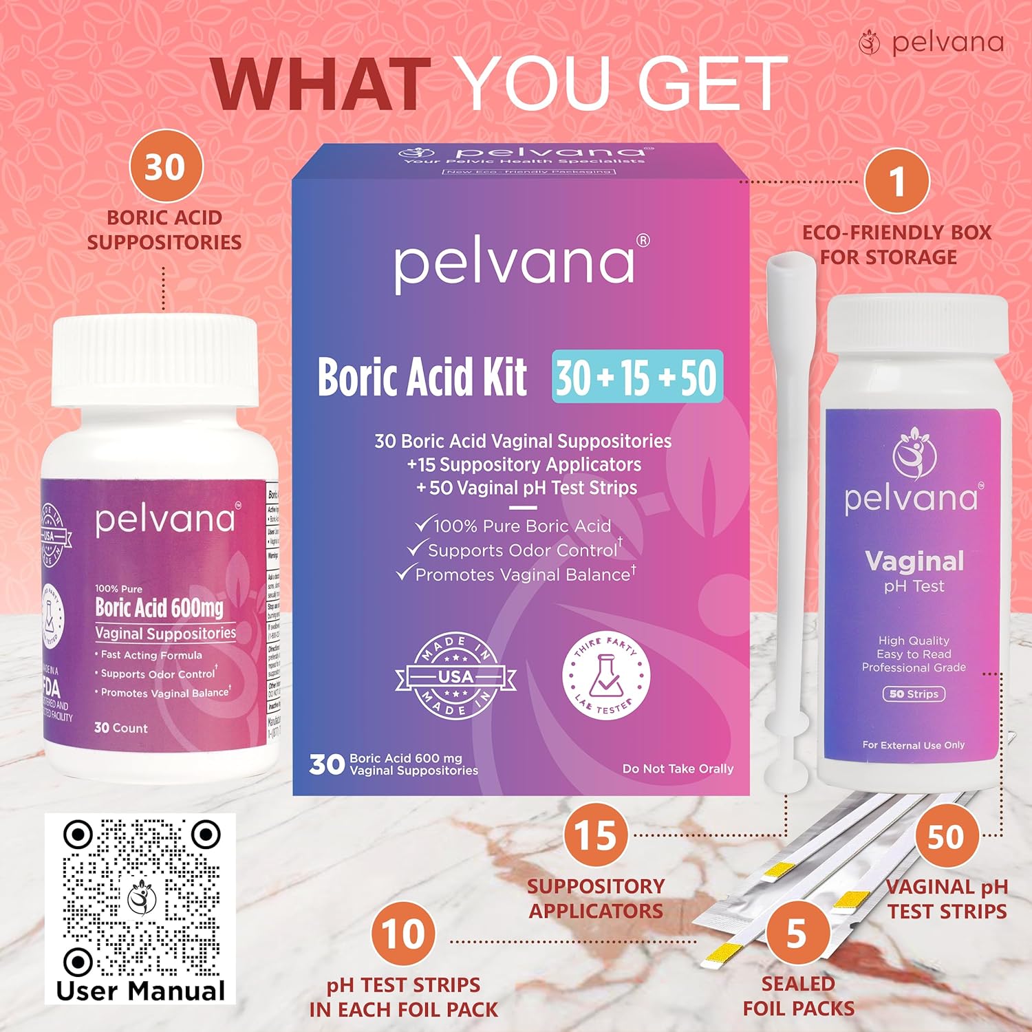 GREAT VALUE - This kit includes 30 boric acid suppositories, 15 applicators, and 50 pH test stripsFAST ACTING - Boric acid helps re-balance your vaginal pH quickly to relieve odor, itching, dryness, and discharge. Many women report feeling fresher in just 12 hoursCAPSULES - Lying on your back with your knees bent and feet flat, use the applicator to insert the capsule as deep as possible into the vaginal canal. Failure to insert the capsule deeply enough into the vaginal canal will prevent the capsule from dissolving properly and may cause it to be expelled when you urinateDURATION - Insert the boric acid capsules before bed for 7 consecutive nights. If unwanted vaginal symptoms persist, repeat boric acid for another 7 nights. You should expect some clear watery discharge, so we recommend sleeping with a panty linerAPPLICATORS - Your body position is critical. Lie on your back with your knees bent and feet flat during insertion to avoid discomfort and jamming the capsule at the tip of the applicator