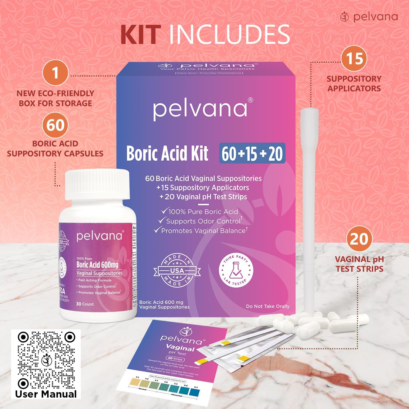 GREAT VALUE - This kit includes 60 boric acid suppositories, 15 applicators, and 20 pH test stripsFAST ACTING - Boric acid helps re-balance your vaginal pH quickly to relieve odor, itching, dryness, and discharge. Many women report feeling fresher in just 12 hoursCAPSULES - Lying on your back with your knees bent and feet flat, use the applicator to insert the capsule as deep as possible into the vaginal canal. Failure to insert the capsule deeply enough into the vaginal canal will prevent the capsule from dissolving properly and may cause it to be expelled when you urinateDURATION - Insert the boric acid capsules before bed for 7 consecutive nights. If unwanted vaginal symptoms persist, repeat boric acid for another 7 nights. You should expect some clear watery discharge, so we recommend sleeping with a panty linerAPPLICATORS - Your body position is critical. Lie on your back with your knees bent and feet flat during insertion to avoid discomfort and jamming the capsule at the tip of the applicator