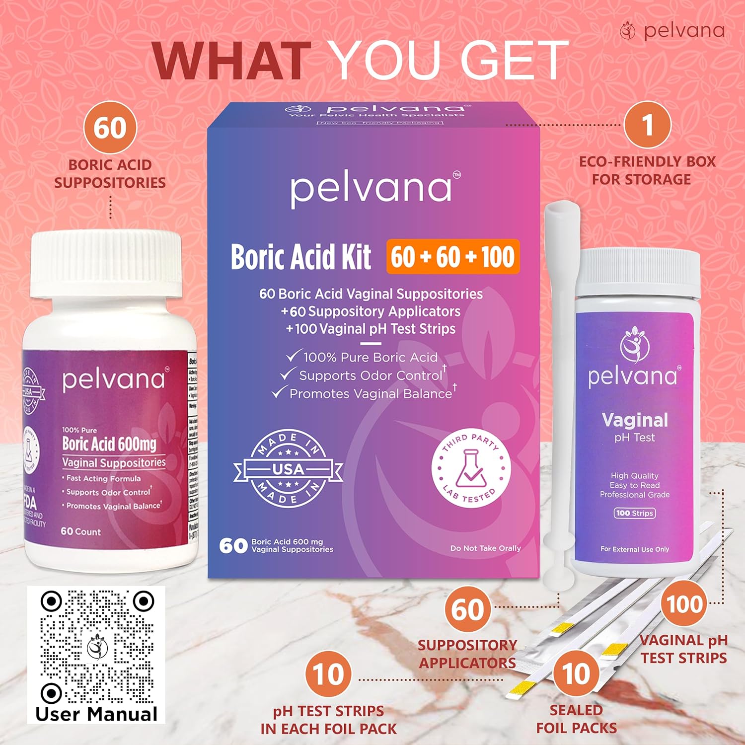 GREAT VALUE - This kit includes; 60 boric acid suppositories, 60 applicators, and 100 pH test stripsFAST ACTING - Boric acid helps re-balance your vaginal pH quickly to relieve odor, itching, dryness, and discharge. Many women report feeling fresher in just 12 hoursCAPSULES - Lying on your back with your knees bent and feet flat, use the applicator to insert the capsule as deep as possible into the vaginal canal. Failure to insert the capsule deeply enough into the vaginal canal will prevent the capsule from dissolving properly and may cause it to be expelled when you urinateDURATION - Insert the boric acid capsules before bed for 7 consecutive nights. If unwanted vaginal symptoms persist, repeat boric acid for another 7 nights. You should expect some clear watery discharge, so we recommend sleeping with a panty linerAPPLICATORS - Your body position is critical. Lie on your back with your knees bent and feet flat during insertion to avoid discomfort and jamming the capsule at the tip of the applicator