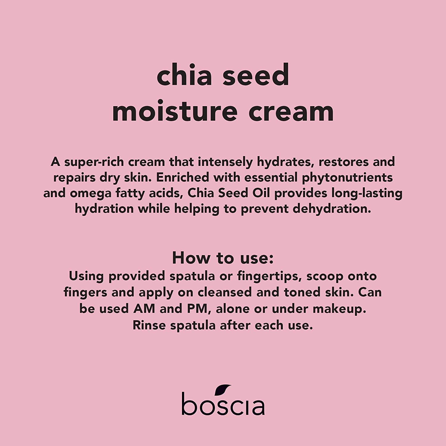 Product Description Ideal for dry skin types and sensitive skin, boscia Chia Seed Moisture Cream uses chia seed oil and Swiss glacier water to deeply hydrate your skin. Brand Story Plants are the secret to our skincare success. We're revolutionizing clean beauty routines around the world with products that are made for play and meant to be shared. Trust us, your skin wants in on the fun,boscia Chia Seed Moisture Cream - Vegan, Cruelty-Free, Natural and Clean Skincare | Super-Rich Moisturizer for Long-lasting Hydration, 1.61 fl. oz