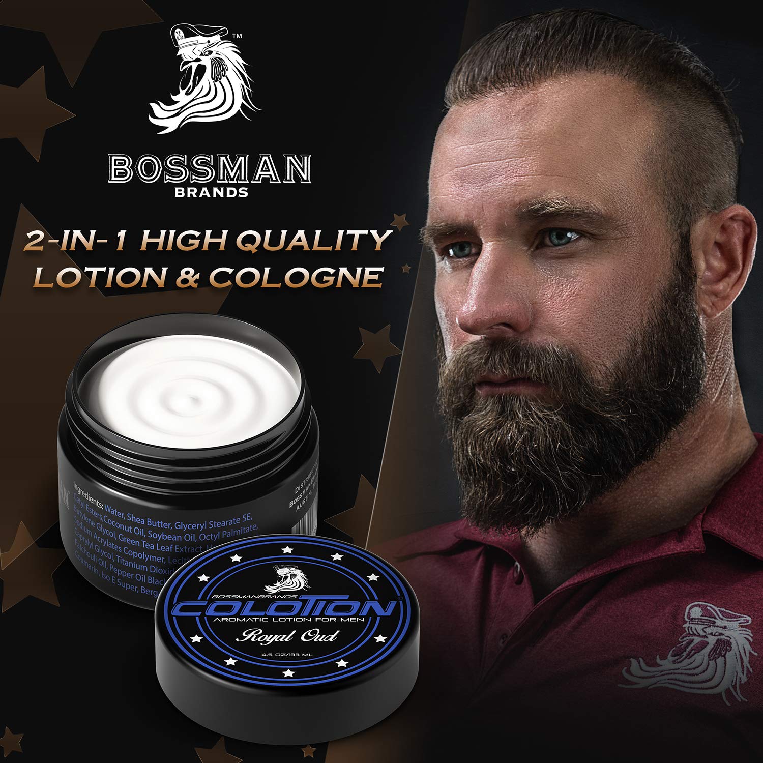 About this item THE GATSBY - Some scents are timeless. They transcend generations and tell a story. The Gatsby is the epitome of energetic, classy with freshness. By utilizing a unique blend of citrus oils like orange, lemon, and a hint of patchouli, your first impression will be clean and crisp. The hint of lavender gives off a smooth finish. Create your own legacy with The Gatsby by Bossman. 5 in 1 Self Care: Your daily skin care routine just got a whole lot easier. Our cologne lotion for men simultaneously hydrates your skin, while blanketing you in an elegant scent that lasts throughout the day. The scented lotion for men does the job of a moisturizer and cologne, all in one easy to apply grooming product A Moisturizer for Men: Bossman Colotion is a moisturizing scented body lotion for men, packed with helpful nutrients. Active ingredients such as shea butter and coconut oil give our mens moisturizer the ability to help relieve dry skin, hydrating it for a smoother, more supple feel that lasts all day long Fragrances Made From Natural Ingredients: Our mens lotion cologne is unlike any other colognes out there. Formulated with natural, chemical free essential oils to create a strong, long lasting scent, our men's cologne won't dry out or irritate your skin Long Lasting, High Quality Fragrances: Be warned that our alcohol free mens lotion scented isn't for those seeking to fly under the radar. We made Colotion so you can be the Boss you deserve to be. It's a healthier and longer lasting alternative to traditional colognes that keeps you smelling incredible all day and night. Just be ready for the non stop barrage of compliments. See more product details,THE GATSBY - Some scents are timeless. They transcend generations and tell a story. The Gatsby is the epitome of energetic, classy with freshness. By utilizing a unique blend of citrus oils like orange, lemon, and a hint of patchouli, your first impression will be clean and crisp. The hint of lavender gives off a smooth finish. Create your own legacy with The Gatsby by Bossman,5 in 1 Self Care: Your daily skin care routine just got a whole lot easier. Our cologne lotion for men simultaneously hydrates your skin, while blanketing you in an elegant scent that lasts throughout the day. The scented lotion for men does the job of a moisturizer and cologne, all in one easy to apply grooming product,A Moisturizer for Men: Bossman Colotion is a moisturizing scented body lotion for men, packed with helpful nutrients. Active ingredients such as shea butter and coconut oil give our mens moisturizer the ability to help relieve dry skin, hydrating it for a smoother, more supple feel that lasts all day long,Fragrances Made From Natural Ingredients: Our mens lotion cologne is unlike any other colognes out there. Formulated with natural, chemical free essential oils to create a strong, long lasting scent, our men's cologne won't dry out or irritate your skin,Long Lasting, High Quality Fragrances: Be warned that our alcohol free mens lotion scented isn't for those seeking to fly under the radar. We made Colotion so you can be the Boss you deserve to be. It's a healthier and longer lasting alternative to traditional colognes that keeps you smelling incredible all day and night. Just be ready for the non stop barrage of compliments