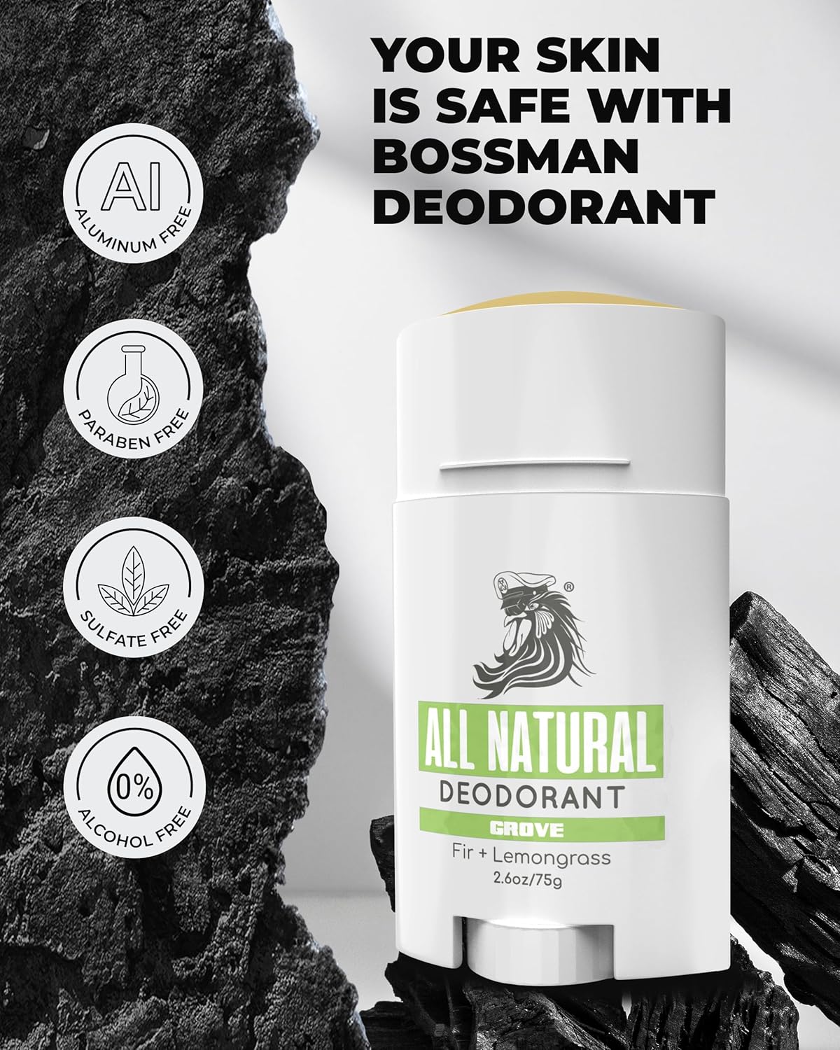 About this item 100% All Natural: Bossman aluminum free deodorant made with pure, plant-based ingredients and free from parabens, sulfates, and artificial fragrances. This clean deodorant formula works in harmony with your body and provides reliable odor protection for 24 hours without exposing your skin to harsh chemicals. Long-Lasting & Effective: Designed for all-day freshness, our body deodorant neutralizes odor at the source without clogging pores. Whether you're at the gym, the office, or on the go, this organic deodorant keeps you feeling clean and confident - without the use of synthetic additives or artificial scents. Gentle & Nourishing for Skin: Enriched with moisturizing shea butter, coconut oil, and arrowroot powder, this sensitive skin deodorant soothes and hydrates while keeping odor in check. This underarm deodorant for men and women glides on smoothly without irritation, leaving skin soft, fresh, and residue-free. Vegan & Cruelty-Free: Ethically made with no animal testing and no animal-derived ingredients, this hypoallergenic deodorant is a guilt-free choice for conscious consumers. The artificial fragrance free deodorant offers a clean, eco-friendly alternative to conventional deodorants - because self-care shouldn’t come at the planet’s expense. Grove Scent: An aluminum free deodorant for men and women delivers a refreshing blend of crisp fir and zesty lemongrass that creates an energizing, clean scent inspired by nature. Naturally derived from pure essential oils, it offers a bright, invigorating aroma that keeps you feeling fresh, grounded, and confident throughout the day. See more product details,100% All Natural: Bossman aluminum free deodorant made with pure, plant-based ingredients and free from parabens, sulfates, and artificial fragrances. This clean deodorant formula works in harmony with your body and provides reliable odor protection for 24 hours without exposing your skin to harsh chemicals,Long-Lasting & Effective: Designed for all-day freshness, our body deodorant neutralizes odor at the source without clogging pores. Whether you're at the gym, the office, or on the go, this organic deodorant keeps you feeling clean and confident - without the use of synthetic additives or artificial scents,Gentle & Nourishing for Skin: Enriched with moisturizing shea butter, coconut oil, and arrowroot powder, this sensitive skin deodorant soothes and hydrates while keeping odor in check. This underarm deodorant for men and women glides on smoothly without irritation, leaving skin soft, fresh, and residue-free,Vegan & Cruelty-Free: Ethically made with no animal testing and no animal-derived ingredients, this hypoallergenic deodorant is a guilt-free choice for conscious consumers. The artificial fragrance free deodorant offers a clean, eco-friendly alternative to conventional deodorants - because self-care shouldn’t come at the planet’s expense,Grove Scent: An aluminum free deodorant for men and women delivers a refreshing blend of crisp fir and zesty lemongrass that creates an energizing, clean scent inspired by nature. Naturally derived from pure essential oils, it offers a bright, invigorating aroma that keeps you feeling fresh, grounded, and confident throughout the day