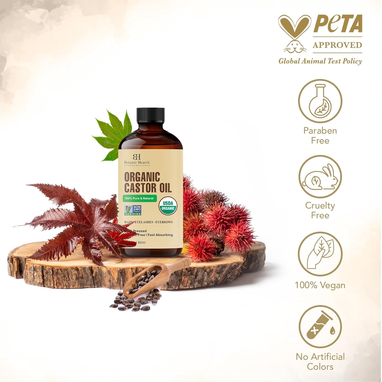 Botanic Hearth Castor Oil (2 Fl Oz) | Usda Organic | 100% Pure, Cold Pressed & Hexane Free | For Hair, Eyelashes, Eyebrows & Scalp Treatment | With Lash & Brow Brush