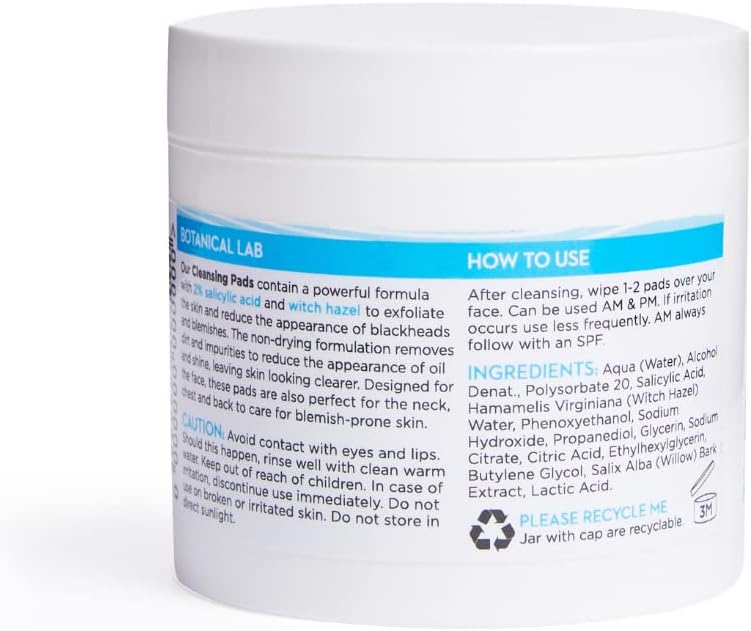 Botanical Lab Witch Hazel + Salicylic Acid Pads (60 Pads) | Exfoliate The Skin | Reduce Appearance Of Pores, Breakouts & Blemishes | Face & Neck | Plastic Free Pads