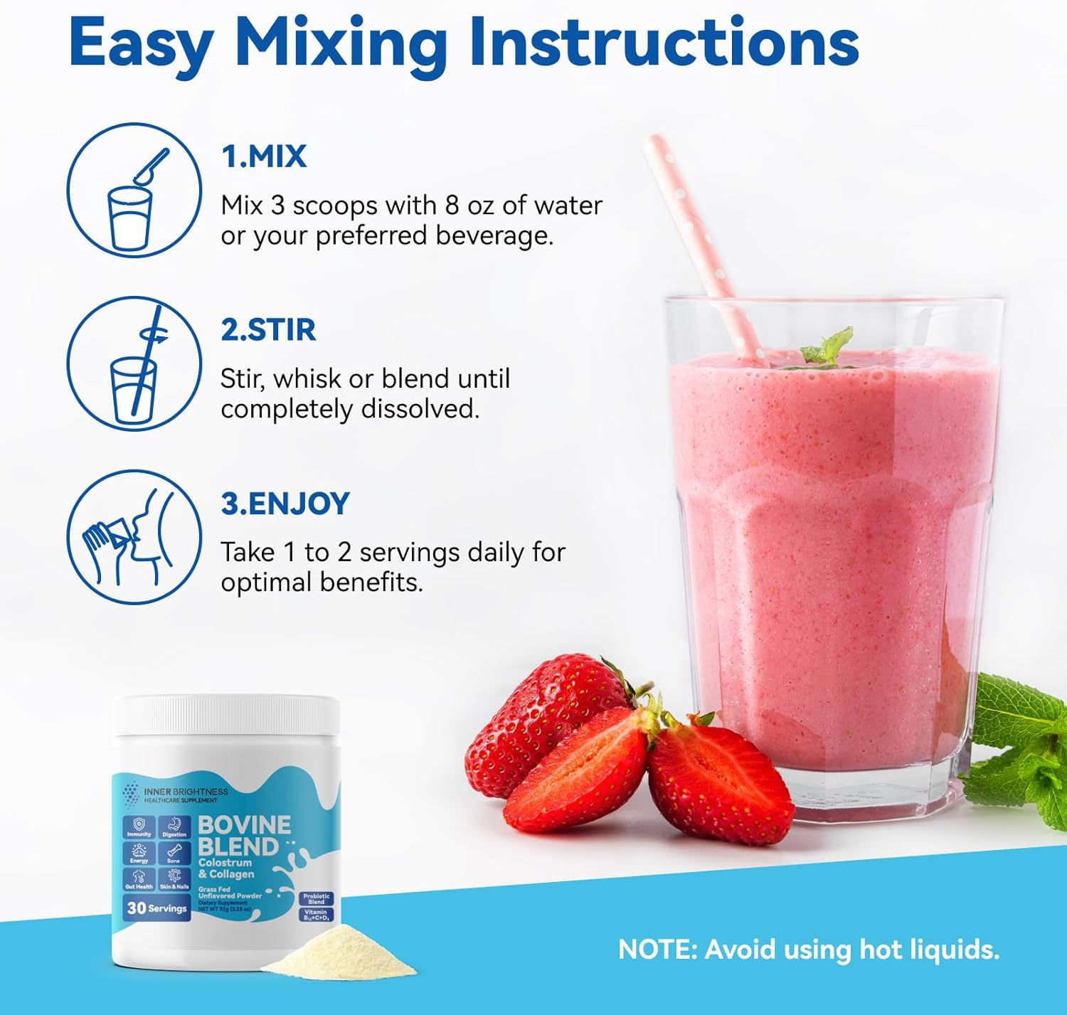 About this item Bovine Colostrum & Grass-Fed Collagen for Skin & Nail Support: Sourced from grass-fed cows in the USA, this product combines bovine colostrum and collagen peptides to enhance skin elasticity, hydration, and nail strength. This potent blend helps improve skin firmness, strengthen nails, and support overall beauty, offering a comprehensive solution for women seeking radiant skin and healthy nails. Bovine Colostrum & Probiotic Blend for Gut & Immune Health: Our formula features bovine colostrum, rich in immune-boosting antibodies and essential growth factors. Combined with a powerful probiotic blend, this colostrum supplement supports digestive health, promotes gut balance, and improves nutrient absorption, enhancing both immunity and digestive function for overall wellness. Made in USA & GMP-Certified Colostrum Supplement: Our bovine colostrum and collagen peptides are ethically sourced from sustainable, grass-fed family farms in the USA. We prioritize calves' nutrition before collecting colostrum. Additionally, this colostrum supplement is proudly Made in the USA and third-party certified, manufactured in a GMP-certified facility to guarantee the highest standards of quality, purity, and safety. Unflavored & Easy to Use Colostrum Powder: This unflavored colostrum powder mixes easily into water, smoothies, or your favorite beverages without altering the taste. It’s an easy and convenient way to integrate beauty, immunity, and gut health support into your daily routine, helping women feel and look their best. Enhanced Solubility – Best Mixed with Warm Water or a Shaker: For optimal mixing, we recommend using water between 40°C and 60°C (104°F - 140°F). If adding to cold drinks, use a shaker bottle or frother for the best dissolving experience. This ensures a smooth and clump-free texture, making it easy to enjoy in coffee, smoothies, or any beverage of your choice. Our colostrum product comes with a small 1g scoop inside the container, which may be slightly hidden within the powder. The compact container size is intended to provide a more concentrated, convenient serving. See more product details,Bovine Colostrum & Grass-Fed Collagen for Skin & Nail Support: Sourced from grass-fed cows in the USA, this product combines bovine colostrum and collagen peptides to enhance skin elasticity, hydration, and nail strength. This potent blend helps improve skin firmness, strengthen nails, and support overall beauty, offering a comprehensive solution for women seeking radiant skin and healthy nails,Bovine Colostrum & Probiotic Blend for Gut & Immune Health: Our formula features bovine colostrum, rich in immune-boosting antibodies and essential growth factors. Combined with a powerful probiotic blend, this colostrum supplement supports digestive health, promotes gut balance, and improves nutrient absorption, enhancing both immunity and digestive function for overall wellness,Made in USA & GMP-Certified Colostrum Supplement: Our bovine colostrum and collagen peptides are ethically sourced from sustainable, grass-fed family farms in the USA. We prioritize calves' nutrition before collecting colostrum. Additionally, this colostrum supplement is proudly Made in the USA and third-party certified, manufactured in a GMP-certified facility to guarantee the highest standards of quality, purity, and safety,Unflavored & Easy to Use Colostrum Powder: This unflavored colostrum powder mixes easily into water, smoothies, or your favorite beverages without altering the taste. It’s an easy and convenient way to integrate beauty, immunity, and gut health support into your daily routine, helping women feel and look their best,Enhanced Solubility – Best Mixed with Warm Water or a Shaker: For optimal mixing, we recommend using water between 40°C and 60°C (104°F - 140°F). If adding to cold drinks, use a shaker bottle or frother for the best dissolving experience. This ensures a smooth and clump-free texture, making it easy to enjoy in coffee, smoothies, or any beverage of your choice,Our colostrum product comes with a small 1g scoop inside the container, which may be slightly hidden within the powder. The compact container size is intended to provide a more concentrated, convenient serving
