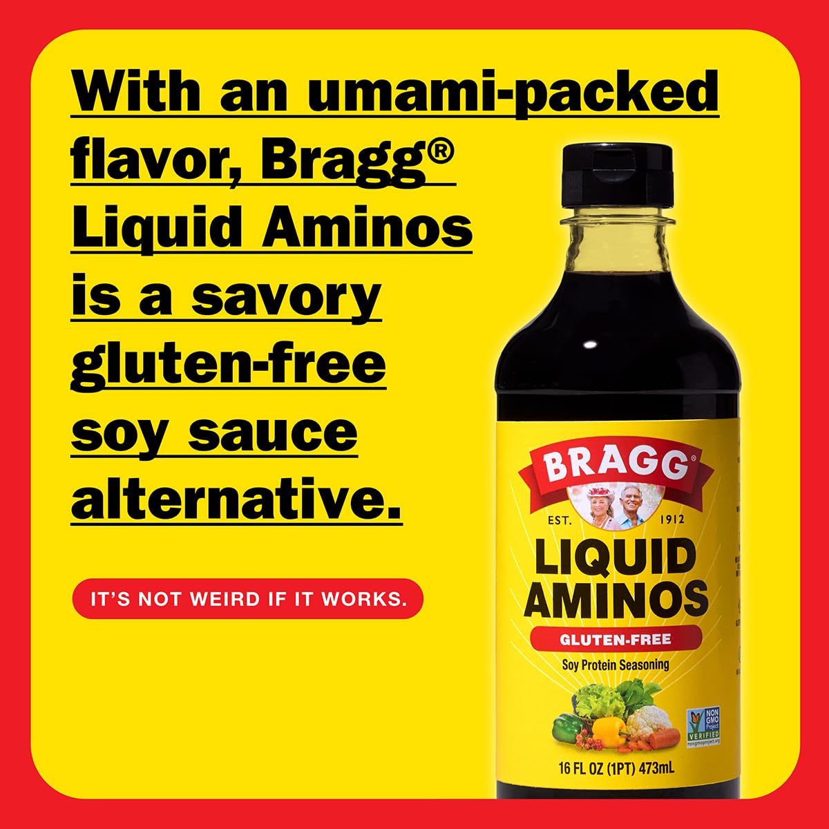 About this item BRAGG LIQUID AMINOS: A gluten-free soy sauce alternative made from non-GMO soybeans; An original recipe created by Paul Bragg himself LIQUID PROTEIN SEASONING: Liquid soy protein combined with an umami-packed flavor with 16 essential and non-essential amino acids, perfect for any dishes calling for traditional soy or tamari sauce VERSATILE SEASONING: Great for stir-fries with fish, tofu, chicken, or beef, as well as marinades, dressings, soups, vegetables, rice, and more THE BRAGG DIFFERENCE: Vegan, Alcohol-free, Gluten-free, Kosher, Non-GMO Project Verified, and Paleo-friendly See more product details,BRAGG LIQUID AMINOS: A gluten-free soy sauce alternative made from non-GMO soybeans; An original recipe created by Paul Bragg himself,LIQUID PROTEIN SEASONING: Liquid soy protein combined with an umami-packed flavor with 16 essential and non-essential amino acids, perfect for any dishes calling for traditional soy or tamari sauce,VERSATILE SEASONING: Great for stir-fries with fish, tofu, chicken, or beef, as well as marinades, dressings, soups, vegetables, rice, and more,THE BRAGG DIFFERENCE: Vegan, Alcohol-free, Gluten-free, Kosher, Non-GMO Project Verified, and Paleo-friendly