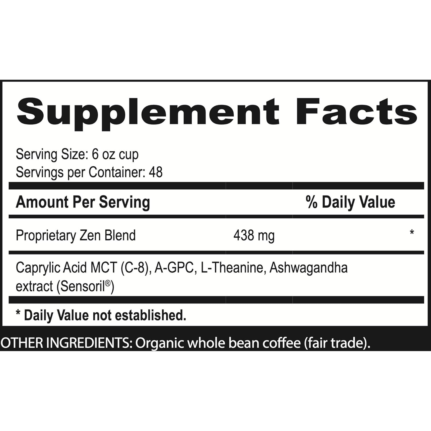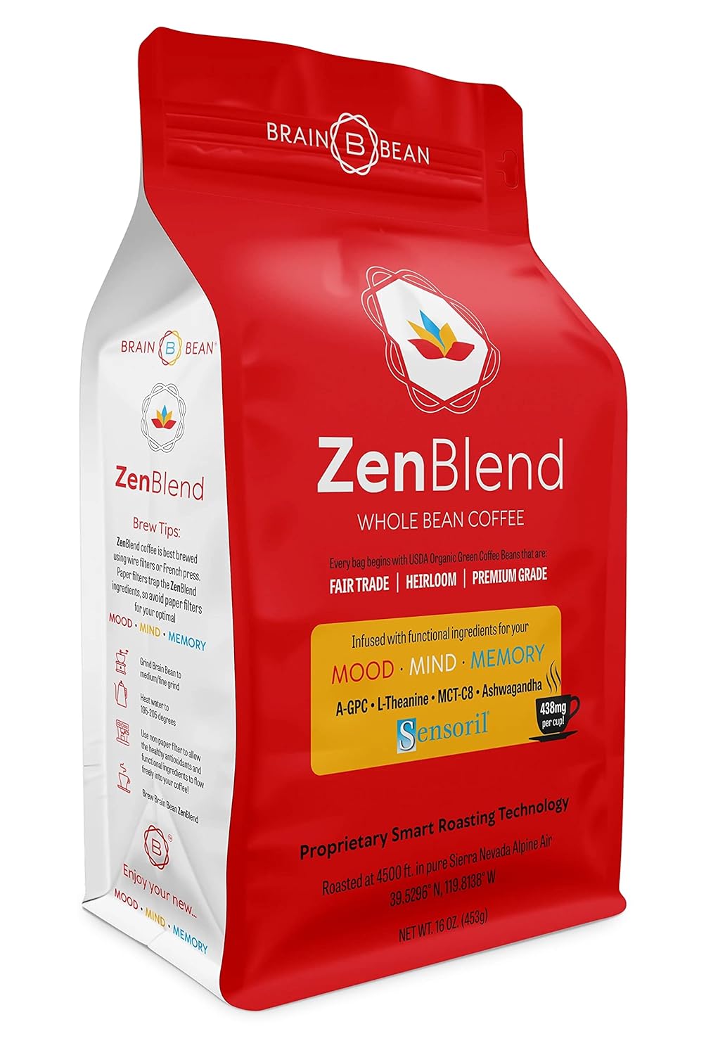 Zen-Blend Infused Coffee Provides A Calming Start To Your Day! Brain Bean Zen-Blend Brings A Whole New Experience To Your Morning Cup Of Coffee. Starting With Our Hand-Selected Usda Organic, Fair Trade Green Coffee Beans Roasted To Perfection In Frequent Small Batches To Preserve And Maintain Amazingly High Levels Of The Antioxidants Including Chlorogenic Acid At Over 2 Times The Level Of Commercially Roasted Coffees. Next, We Infused Our Freshly Roasted Beans With Our Functional Zen Blend: C8 Mct Oil, Sensoril Ashwagandha, A-Gpc, And L-Theanine Providing You Over 430 Mg Per Six-Ounce Cup!! This Potent Combination Of Infused Organic Coffee Will Get Your Day Started Off Right While Enjoying The Smoothest Cup Of Coffee You Have Ever Experienced. Stay Calm And Carry On With Zen-Blend!