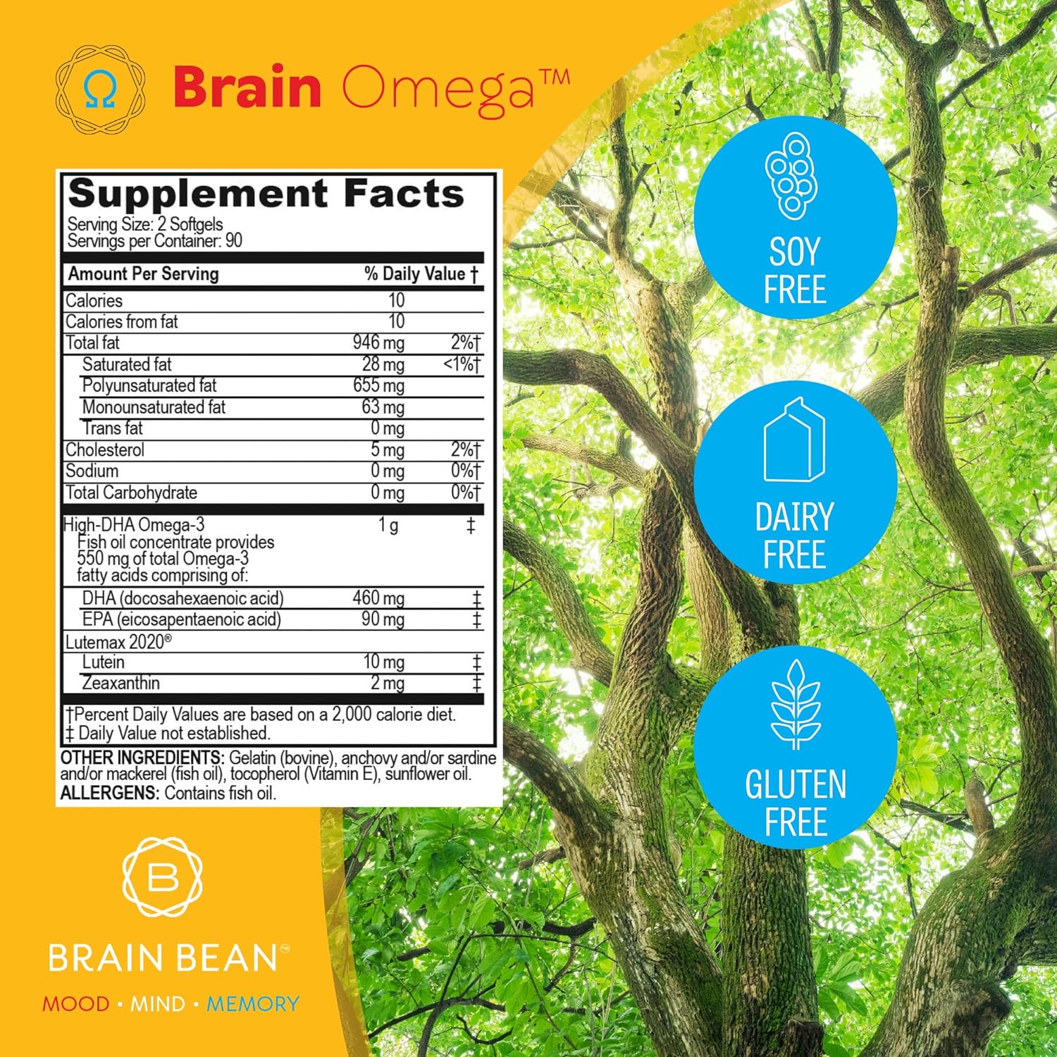Brain Omega With Lutein & Zeaxanthin, Supports Heart And Eye Health, | Omega 3 Plus Lutein And Zeaxanthin Supplements 460 Mg Dha 90 Mg Epa Lutein And Zeaxanthin | 180 Softgels, 90 Servings