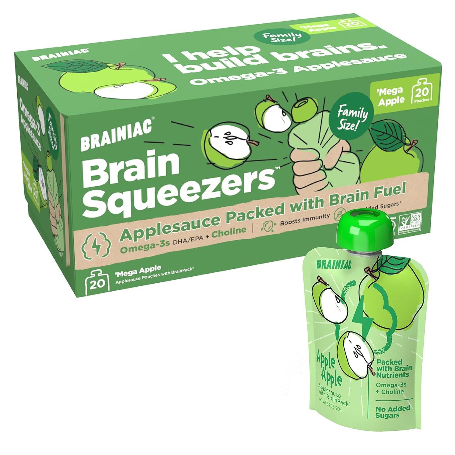 Brainiac Kids Applesauce Pouches with Omega-3s: Contains 20, 3.2 oz. pouches of Mega Apple Unsweetened Applesauce with Immune Boosting Vitamin C, Omega-3s and Choline10Tasty Applesauce That Fuels Your Child's Brain: One pouch of Brainiac Kids Applesauce has 160mg of Omega-3 DHA/EPA and 120mg of choline making it a healthy, delicious and convenient snack for children of all ages10No Added Sugars and Clean, Real Ingredients: Brainiac Food's Applesauce pouches are ready-to-go and made with seasonal, non-GMO and 100% US grown apples. There’s no sugar added and they're gluten-free, and dairy-free10Backed By A Team of Experts: Brainiac Kids snacks were developed by a team of pediatricians, neurologists, dieticians, and nutrition scientists. All products are to ensure kids get the key nutrients their developing brains need, but are often lacking in their diets10Try Brainiac Foods Full Line of Brain Boosting Products: Brainiac Foods offer delicious, nutritious snacks including Applesauce Squeezers, Brain Butter packs, and Bars that promote brain health and development, and supports healthy gut and immunity. Coming Soon Brainiac Gummies and Little Brainiac fruit pouches10