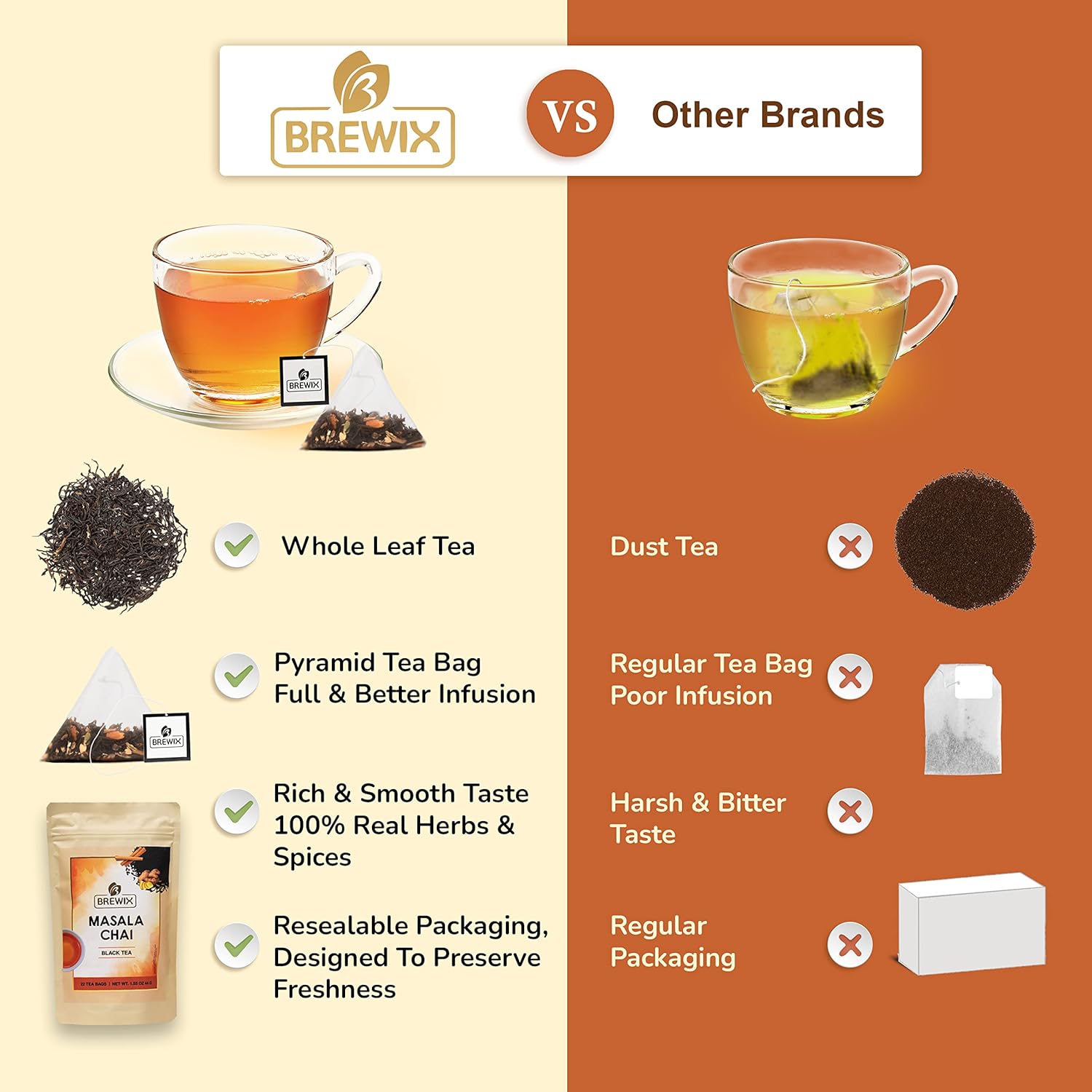 Brewix, Masala Chai Tea Bags (22 Pyramid Tea Bags) Strong, Robust & Spicy - Pure Ingredients | Black Tea, Cinnamon, Ginger, Black Pepper, Cardamom & Cloves, Packed In Resealable Ziplock Pouch