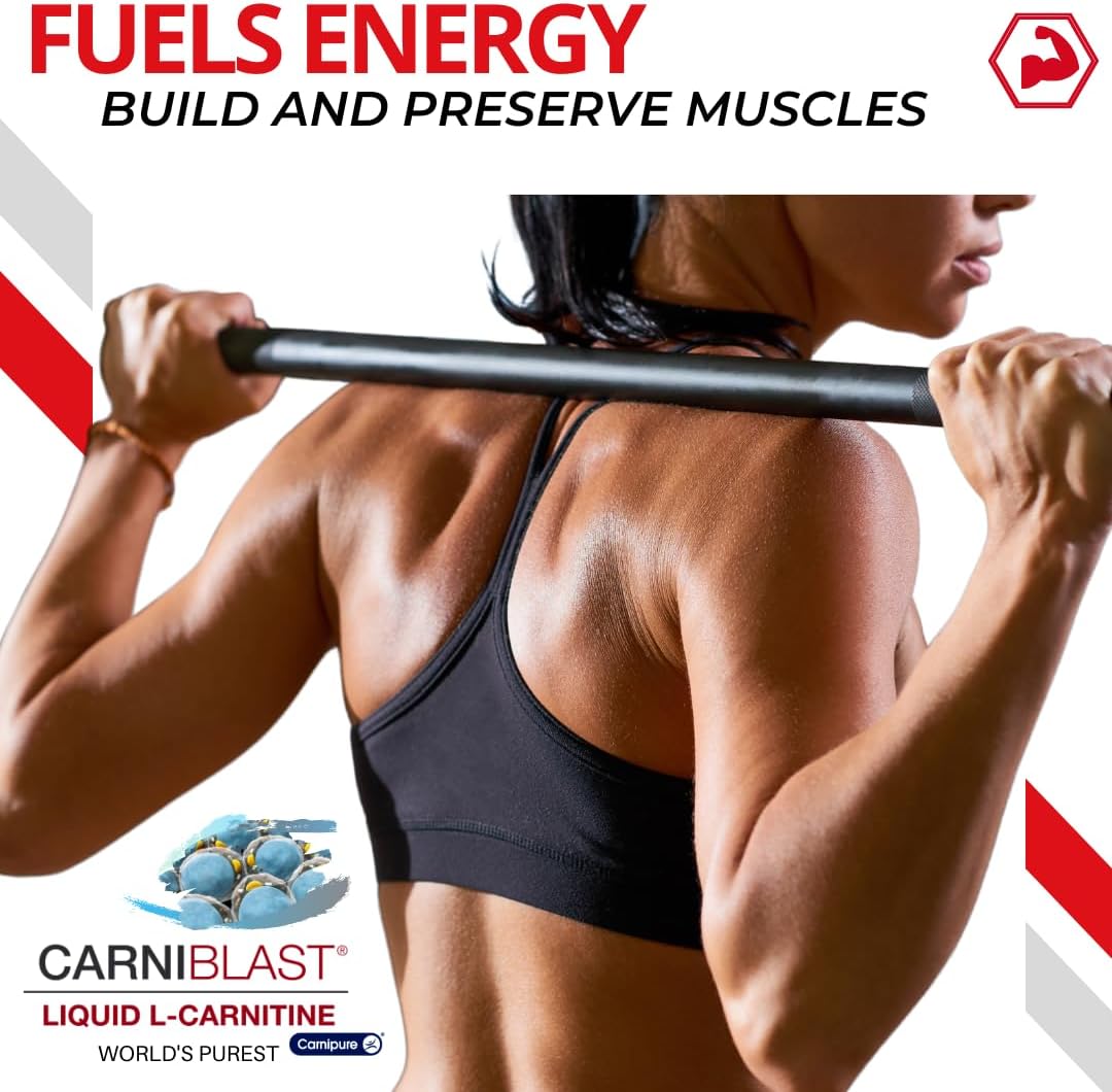 3 >Energy Vitamins and Energy Drink: Carniblast Liquid L Carnitine aids raise energy to build and preserve muscle mass. L Carnitine transports Fatty acids to the mitochondria for energy conversion via beta-oxidation in form of ATP. Carniblast L-Carnitine is the purest L carntine nutrient needed to help support conversion of fat into metabolic energy