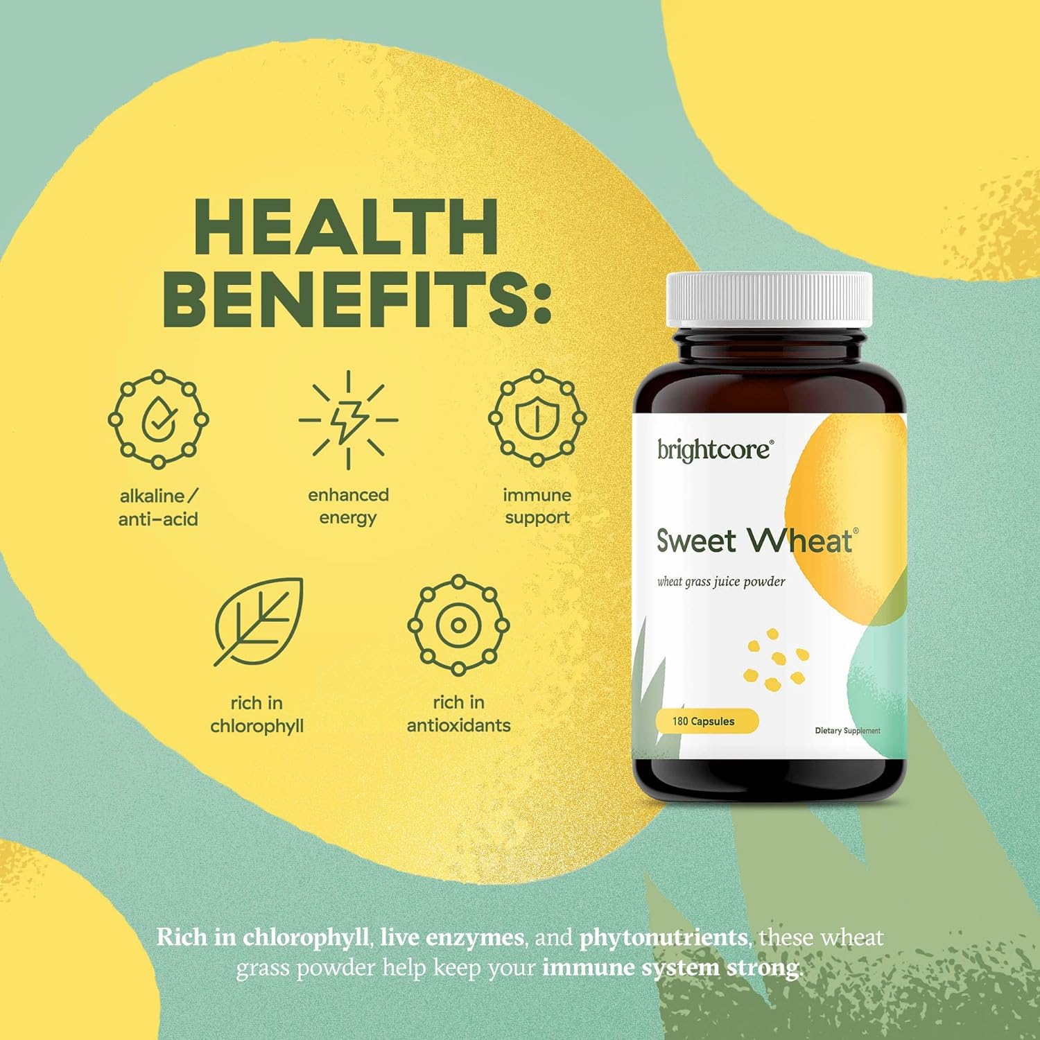 Brightcore Nutrition Sweet Wheat, Ready-To-Drink Athletic Greens, Super Greens With Digestive Enzymes For Digestive Health And Immune Boost, 180 Wheatgrass Juice Powder Capsules