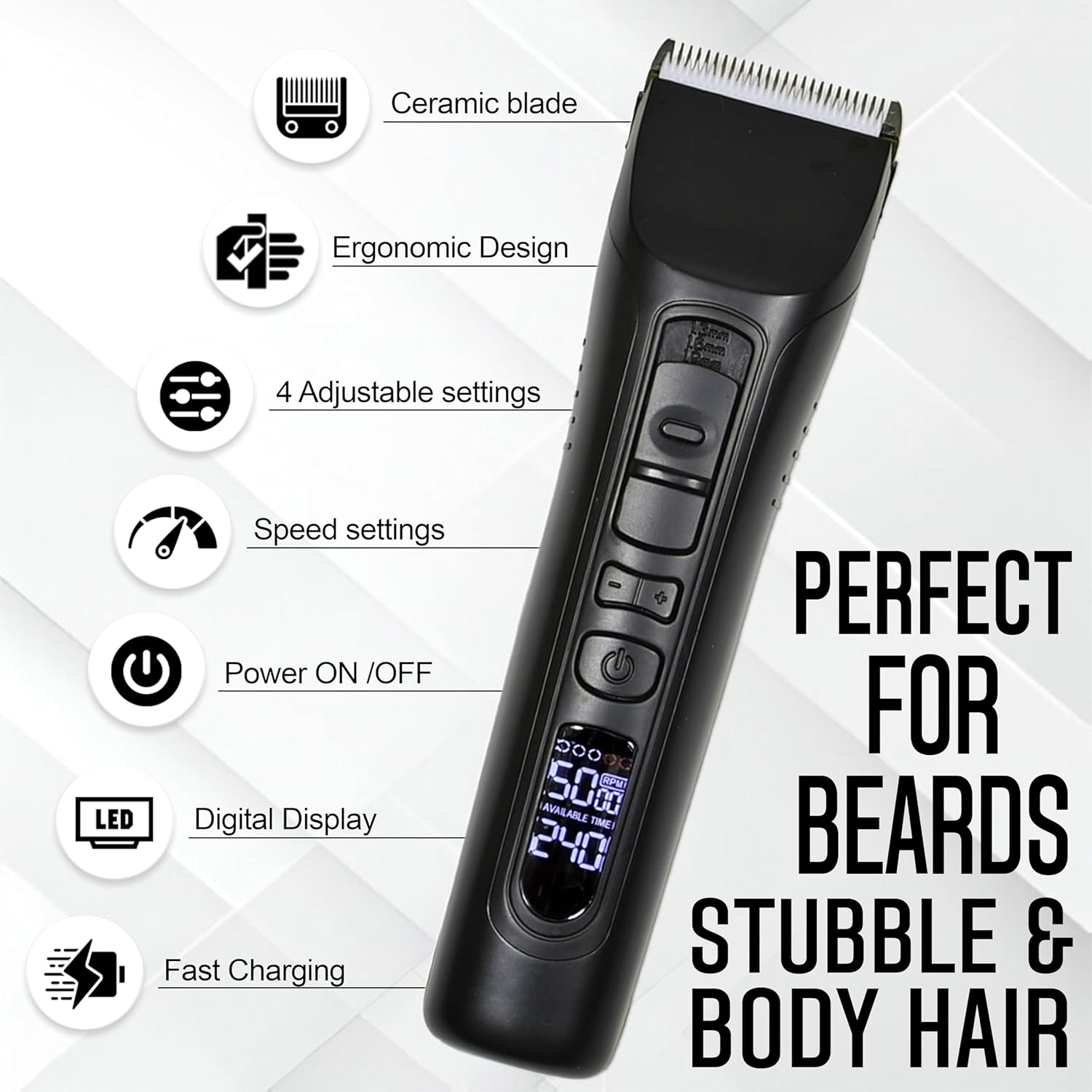 Beardscape electric trimmer for men showcases a low-friction ceramic blade that is 4 times tougher than stainless steel. This innovative design guarantees sharper blades, delivering a smoother cutting experience while effectively reducing heat. Brio beard mens trimmer is sharp enough to cut through the thickest facial hair with ease. As a result, it minimizes discomfort and irritation, making it the perfect choice for any man seeking an exceptional grooming tool