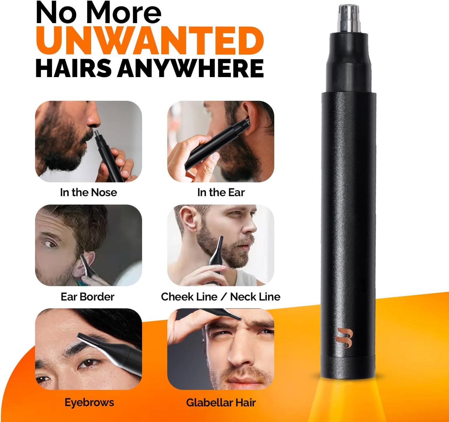 Comfortable and Safe: The sleek design of our nose hair trimmer and ear hair trimmer for men fits comfortably into ears and noses, ensuring a painless and efficient trimming experience. No more worries about scissors and open blades in sensitive areas with our nose trimmer for men