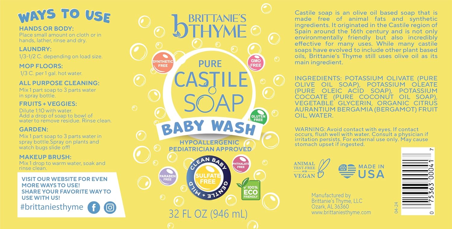 Brittanie'S Pure Organic Castile Liquid Olive Oil Soap Refill, Baby, 1 Gallon | Face, Body Wash, Dishes, Pets & Laundry | Vegan & Gluten Free Non-Gmo