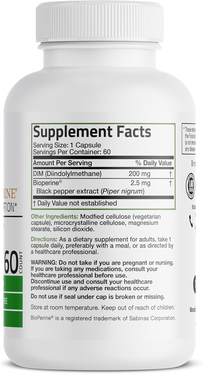 Bronson Dim Supplement 200 Mg Diindolymethane With Bioperine For Enhanced Absorption, Estrogen Metabolism & Maintains Balanced Hormone Levels, 60 Vegetarian Capsules