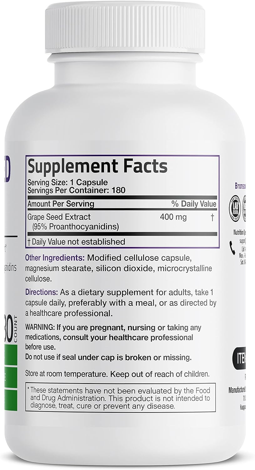 DESCRIPTION : Bronson Grape Seed Extract 400 mg - Antioxidant & Immune Support - Standardized Extract with 95% Proanthocyanidins- Non GMO, 180 Vegetarian Capsules180 Count (Pack of 1)