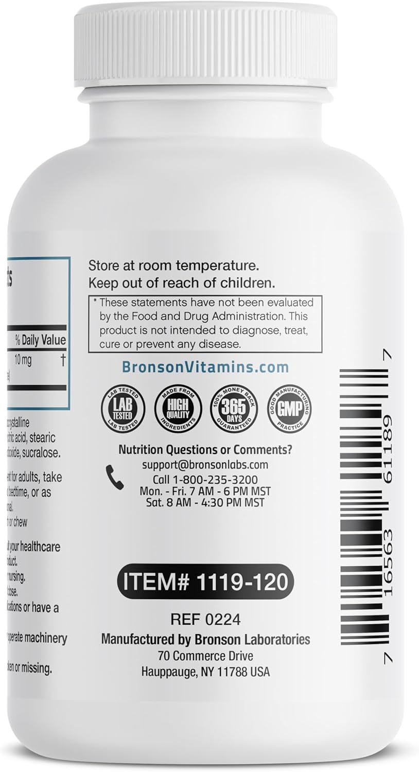 Melatonin Is A Natural Secretion Of The Pineal Gland And Is Produced By The Body To Help Support And Regulate Sleep. Normally, The Body Increases Melatonin Levels When It Is Dark To Help Facilitate Healthy Sleep Patterns And Reduces Melatonin Levels In The Daylight. A Variety Of Factors Can Disrupt The Intricate Melatonin Balance, Including Stress, Shift Work, An Over-Extended Schedule Or Rotating Work Shifts. Researchers Have Found That Melatonin Supports Quality Sleep, Longer Sleep, As Well As The Earlier Onset Of Sleep While Reducing Wakefulness At The Same Time. Bronson’S Melatonin 10 Mg Fast Dissolve Provides An Effective Amount Of Melatonin To Support Healthy Sleep Patterns