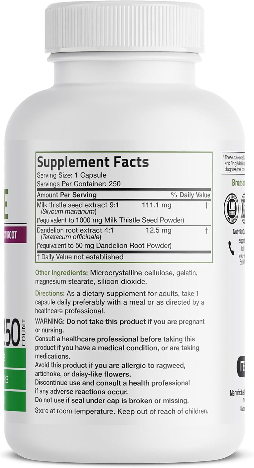 Bronson Milk Thistle Silymarin Marianum & Dandelion Root Liver Health Support, Antioxidant Support, Detox, 250 Capsules